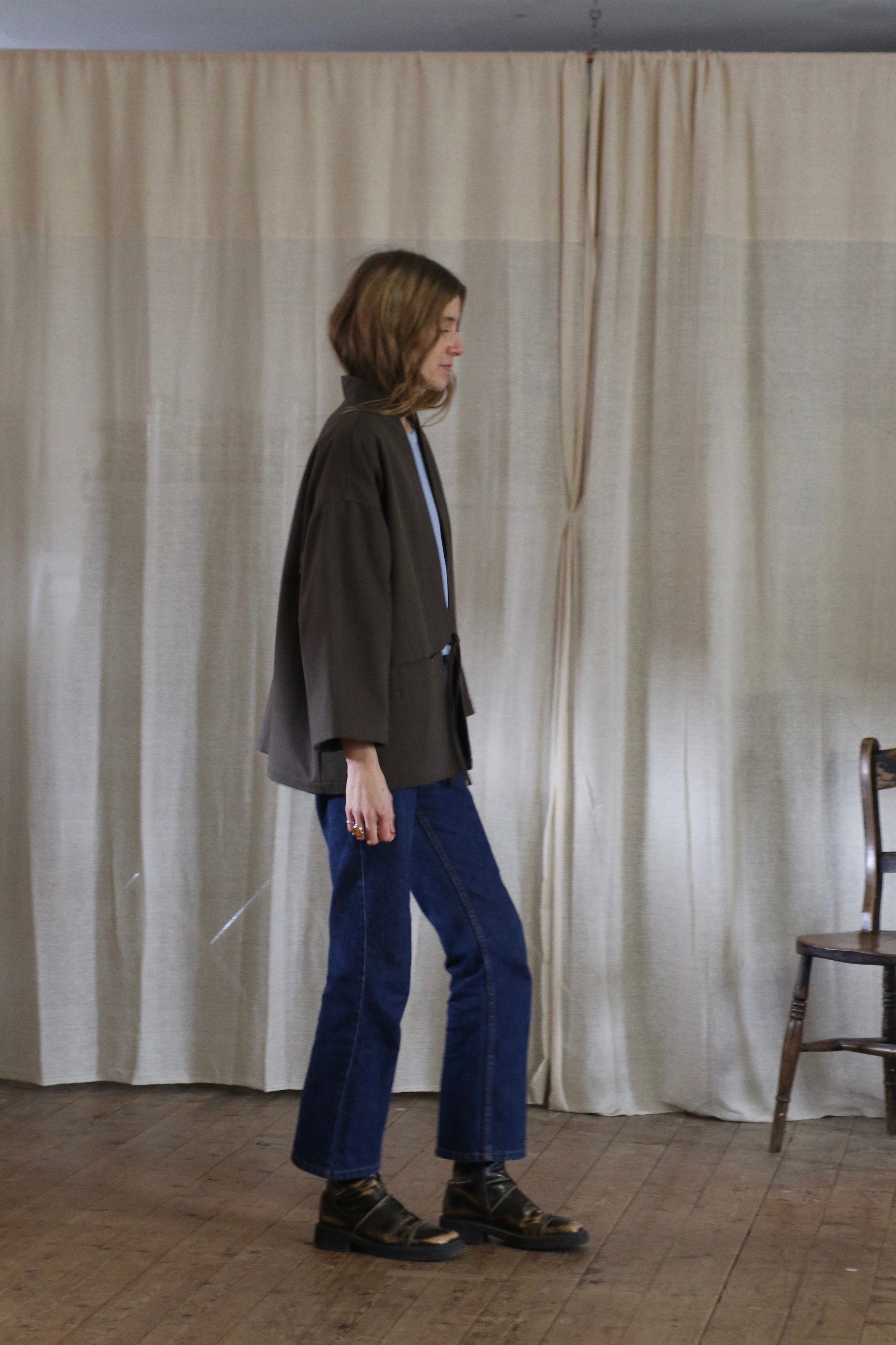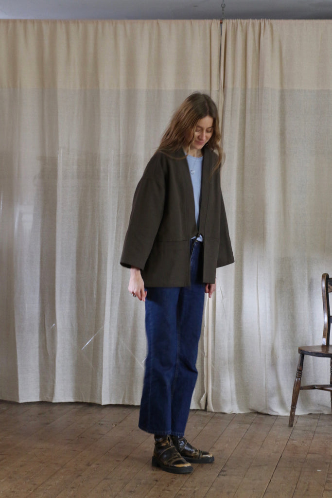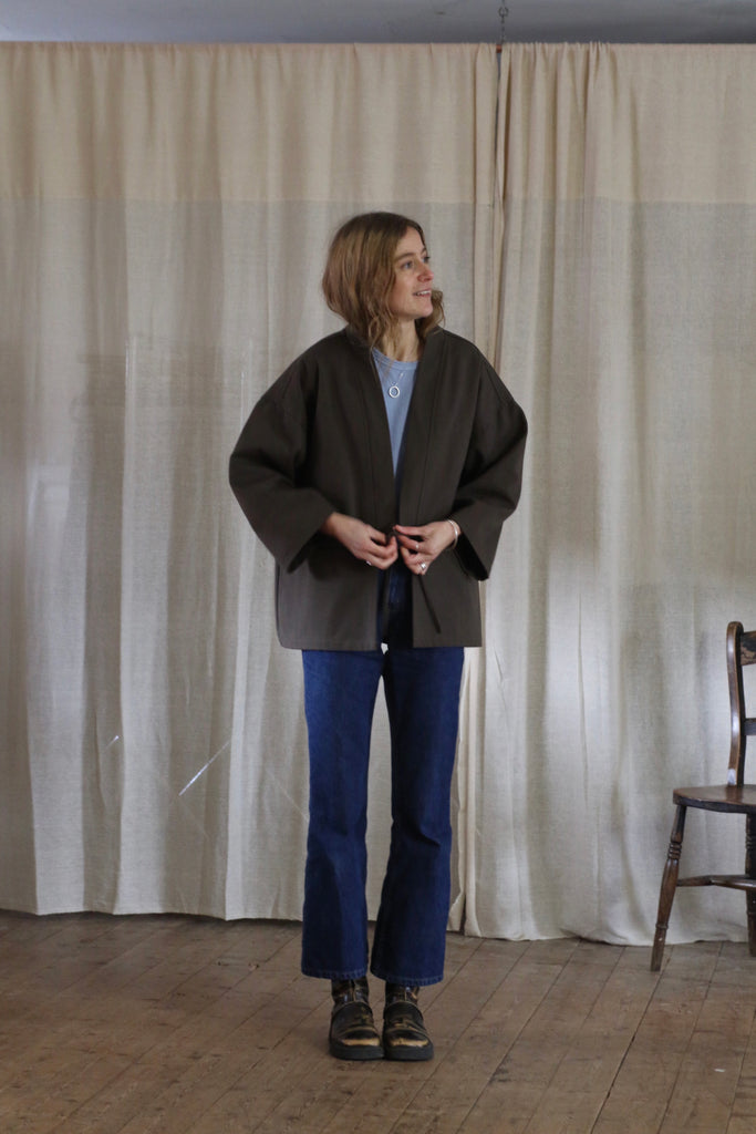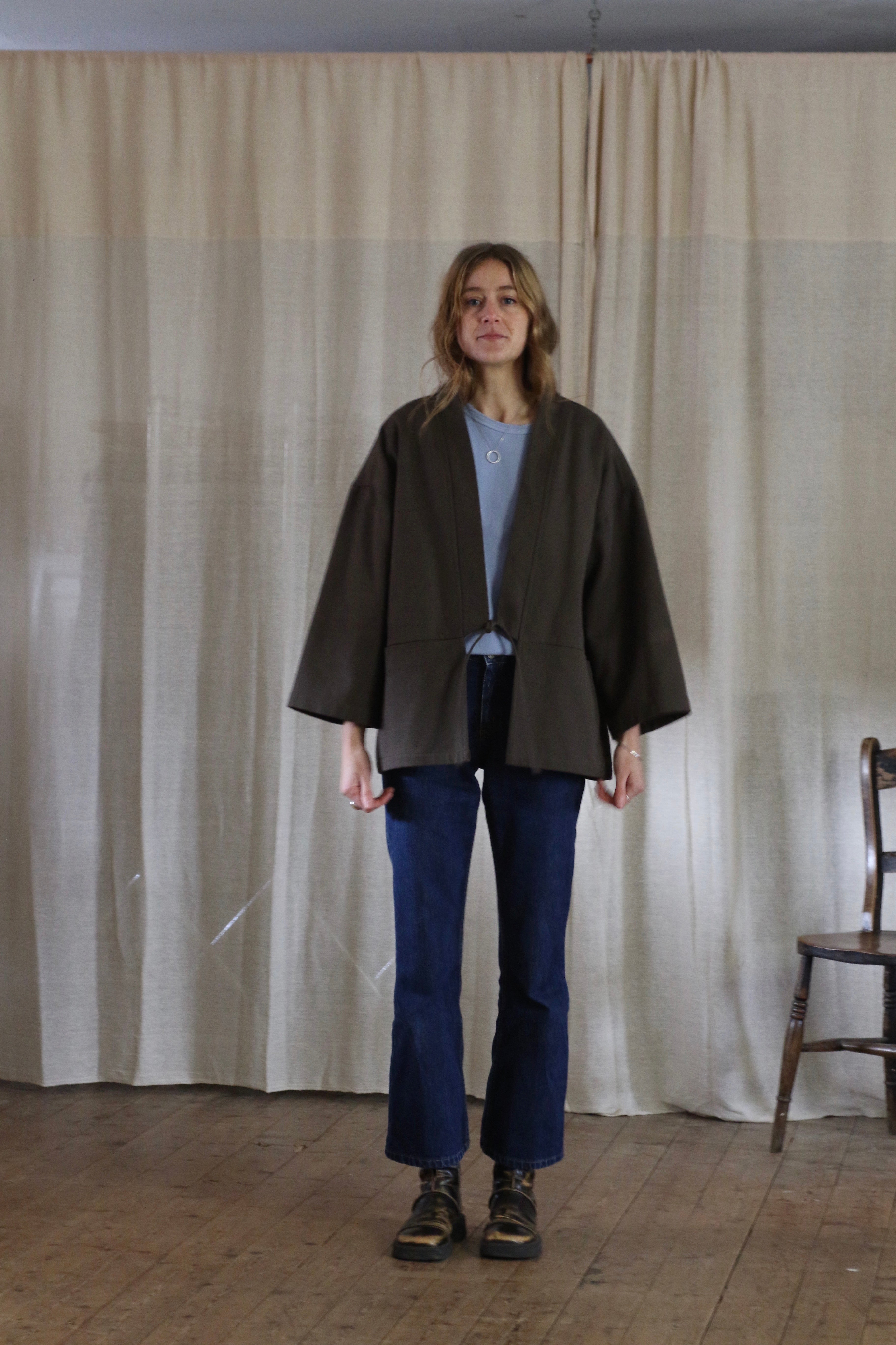 This Garden Kimono is made in dead-stock heavy canvas perfect for workwear. The colour is kind of dark khaki and kind of a deeper taupe colour. The fabric drapes beautifully on the body and the heavier weight makes for a warm layer.