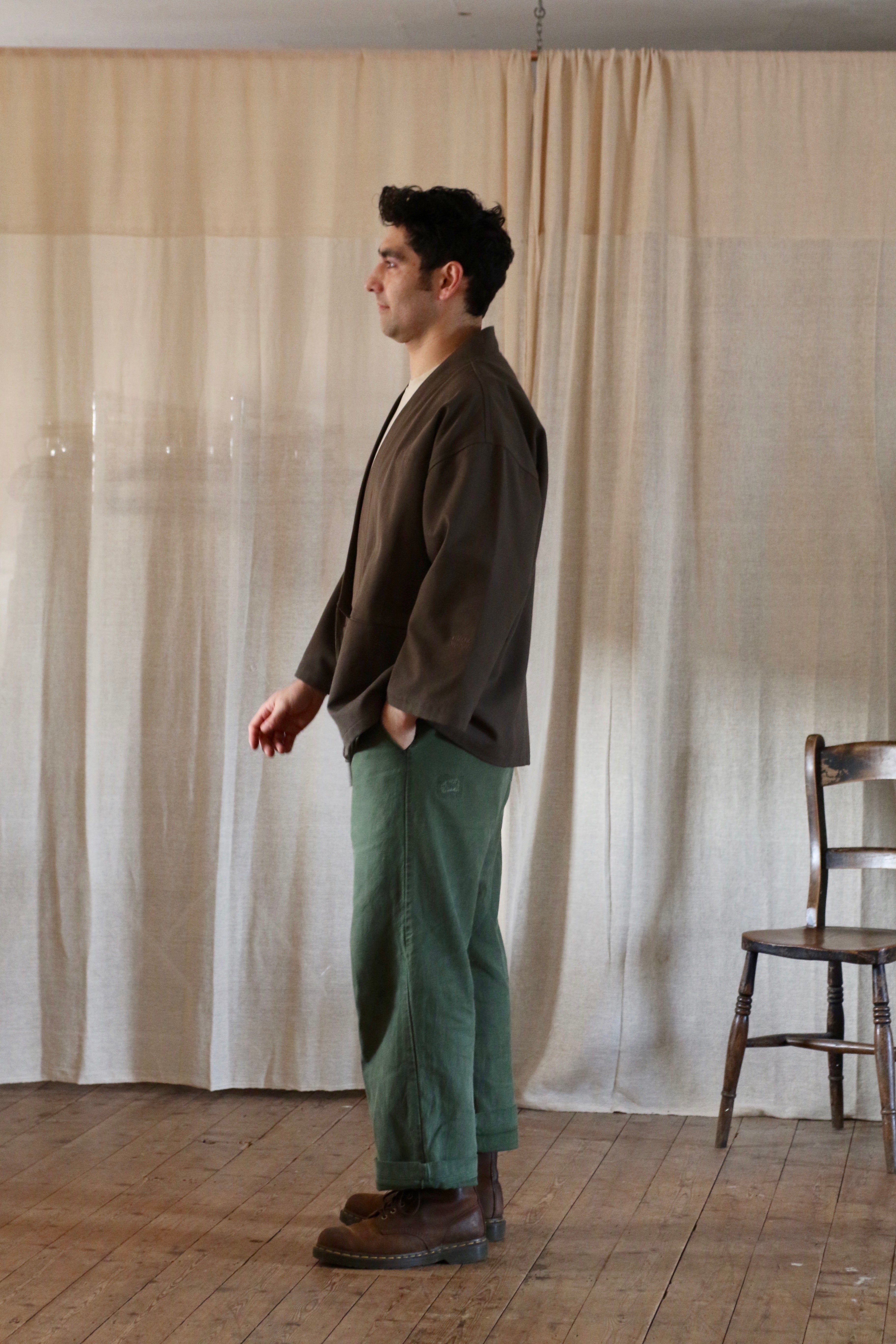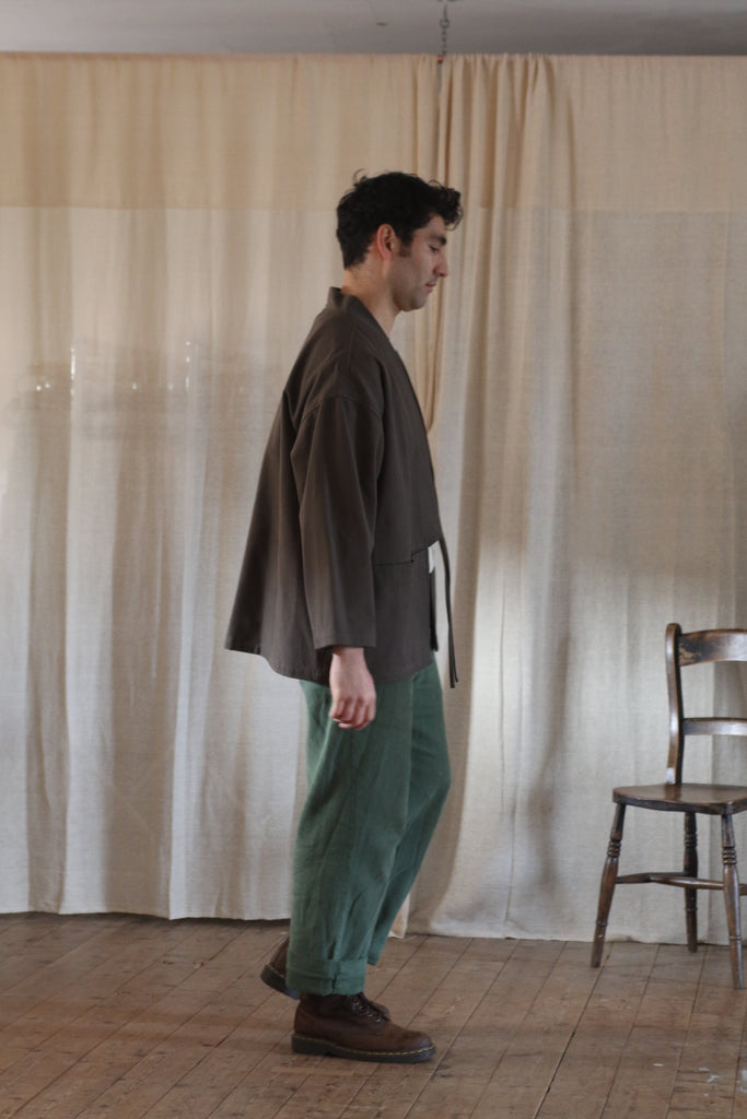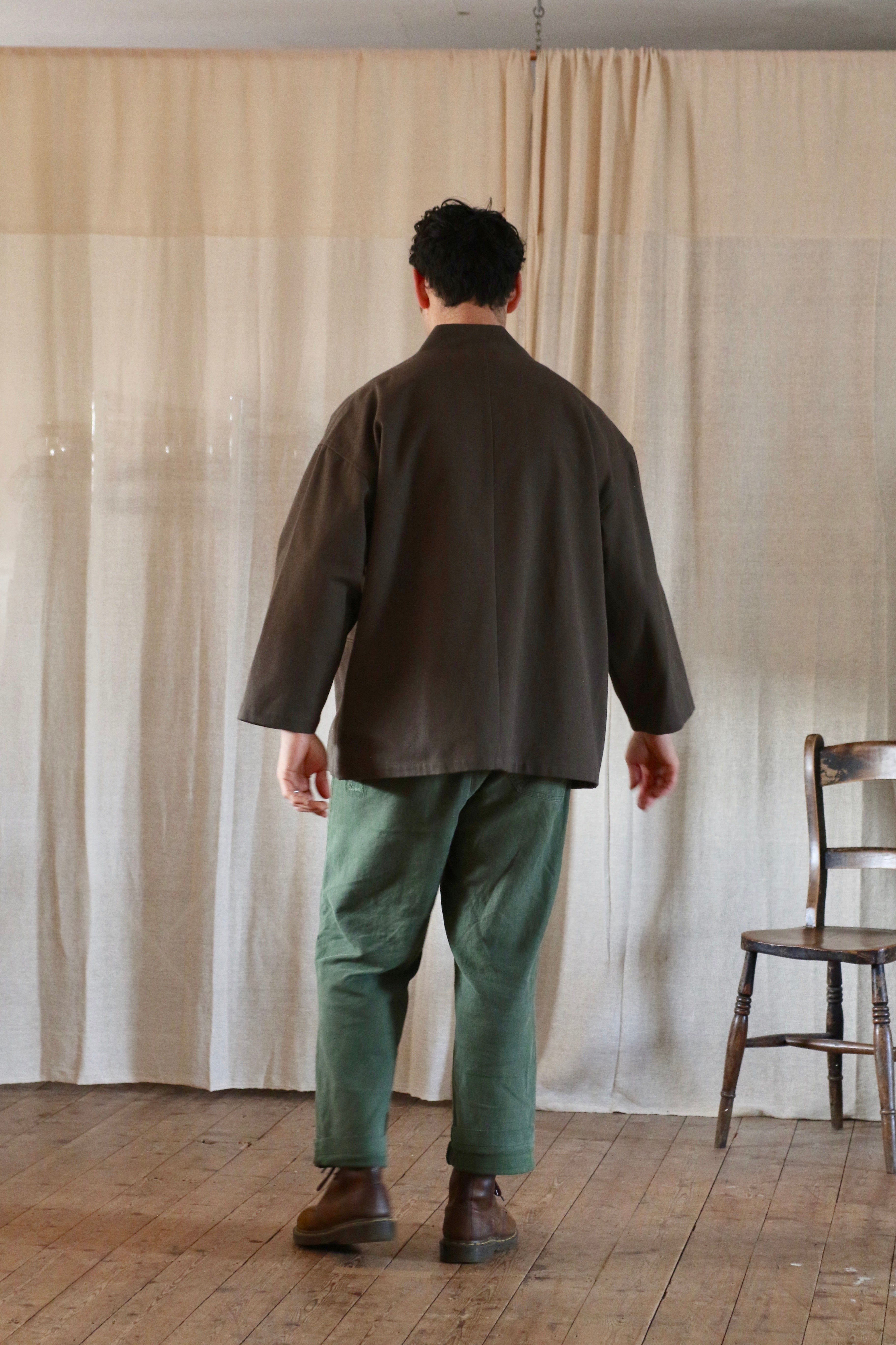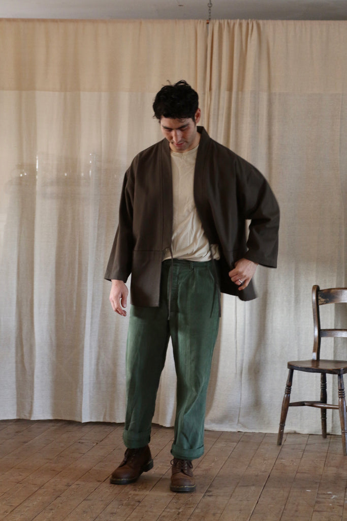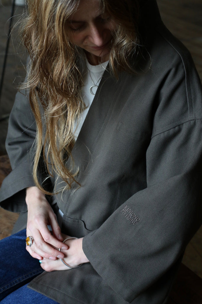 This Garden Kimono is made in dead-stock heavy canvas perfect for workwear. The colour is kind of dark khaki and kind of a deeper taupe colour. The fabric drapes beautifully on the body and the heavier weight makes for a warm layer.