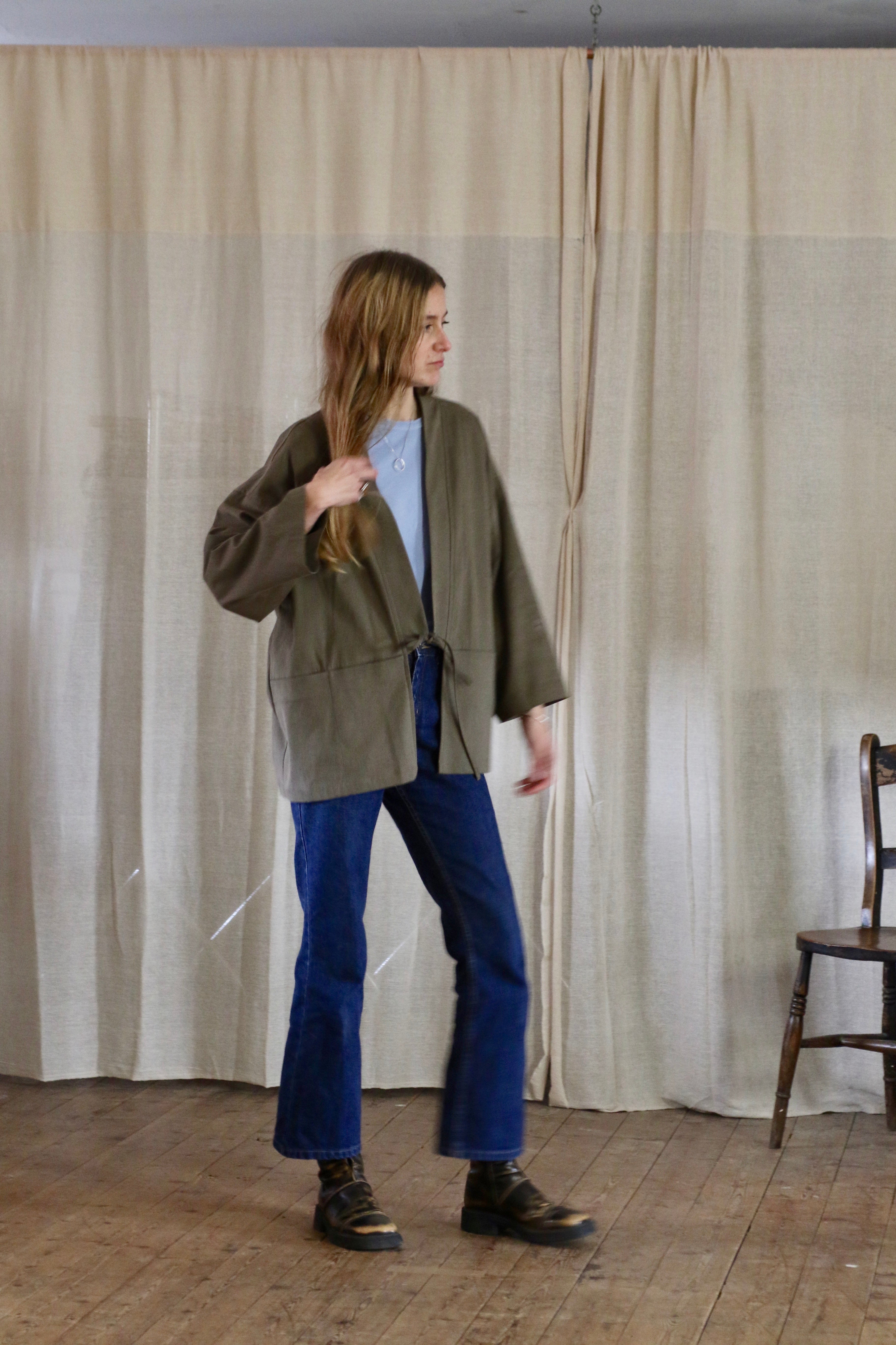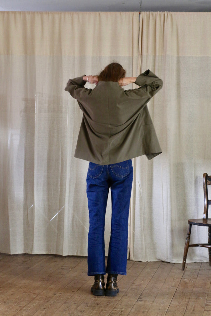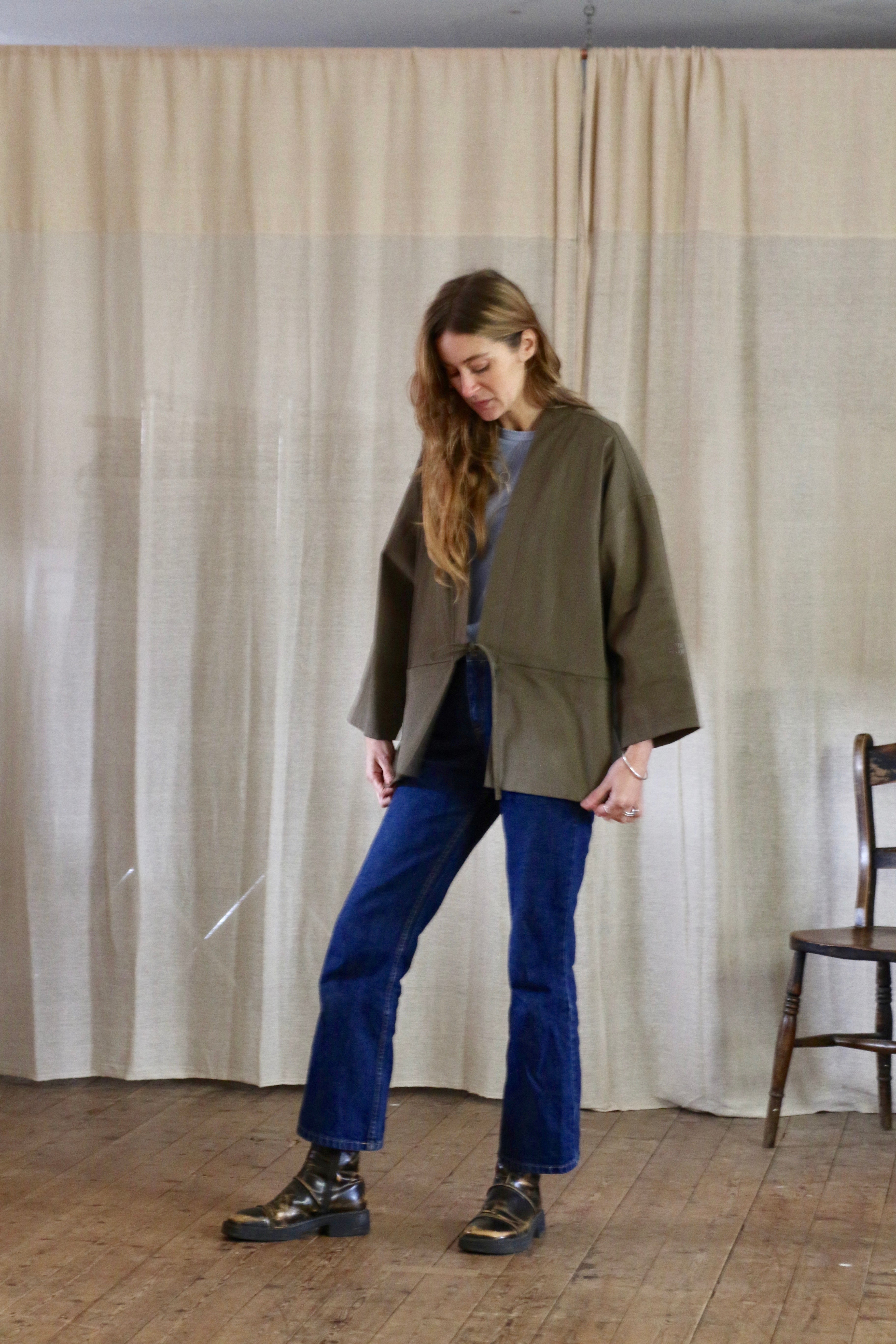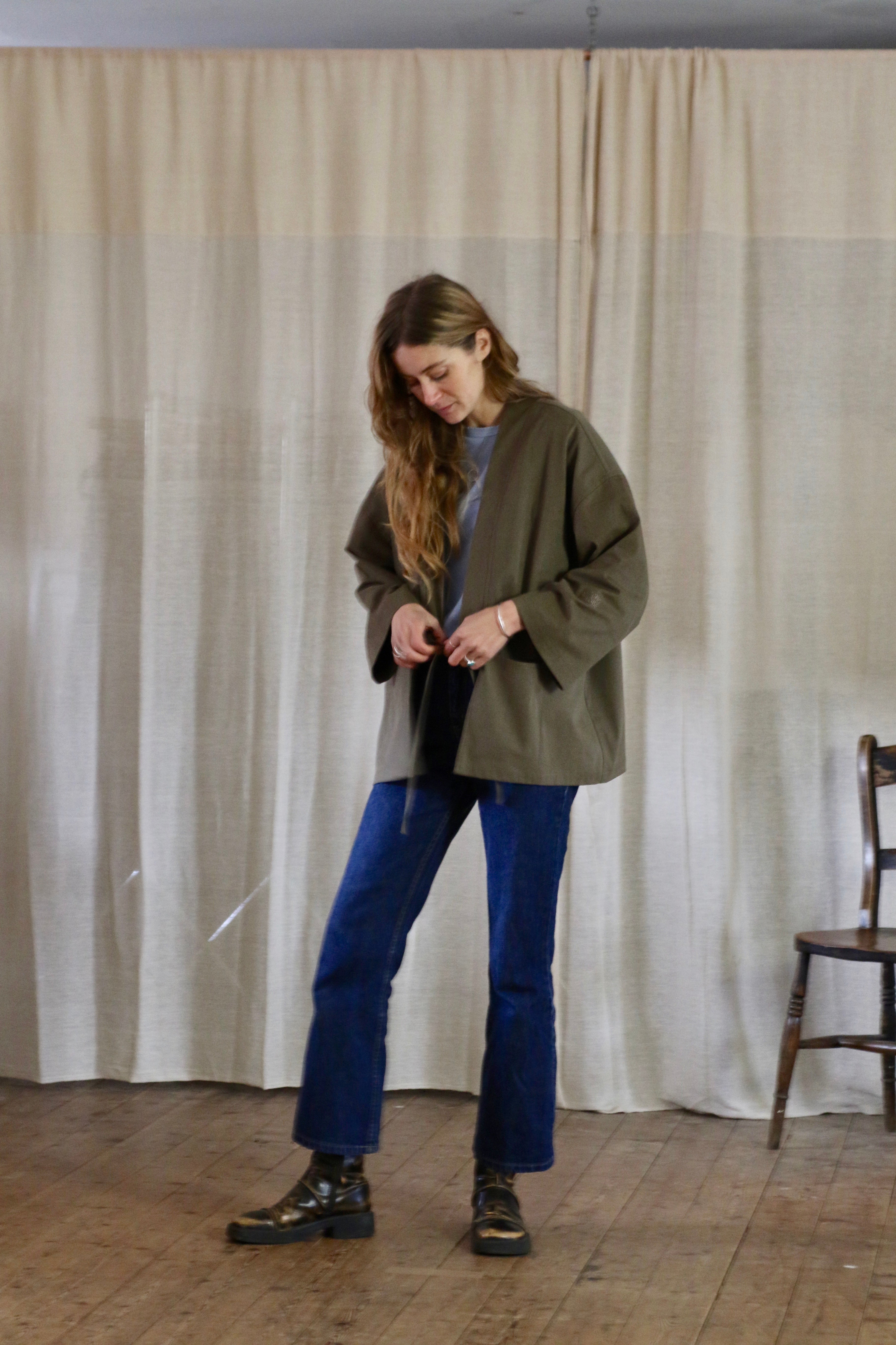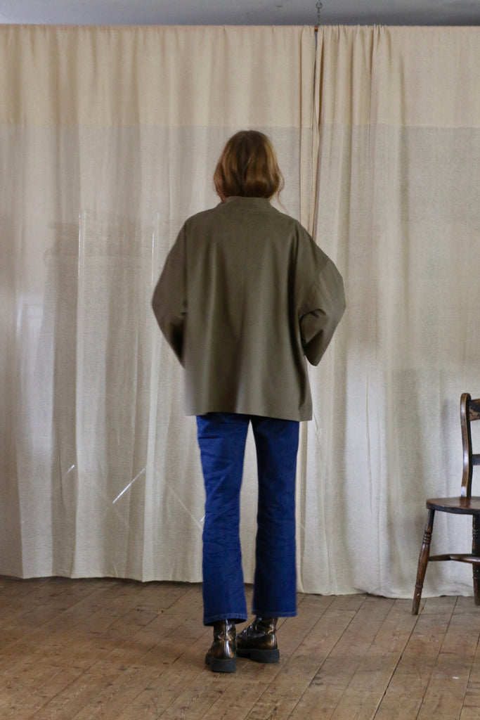 This Garden Kimono is made in dead-stock soft brushed cotton in a medium weight, I'm calling the colour artichoke green but it is a textured khaki colour. The medium weight means this is not a heavy jacket but more of a comfortable layering piece.