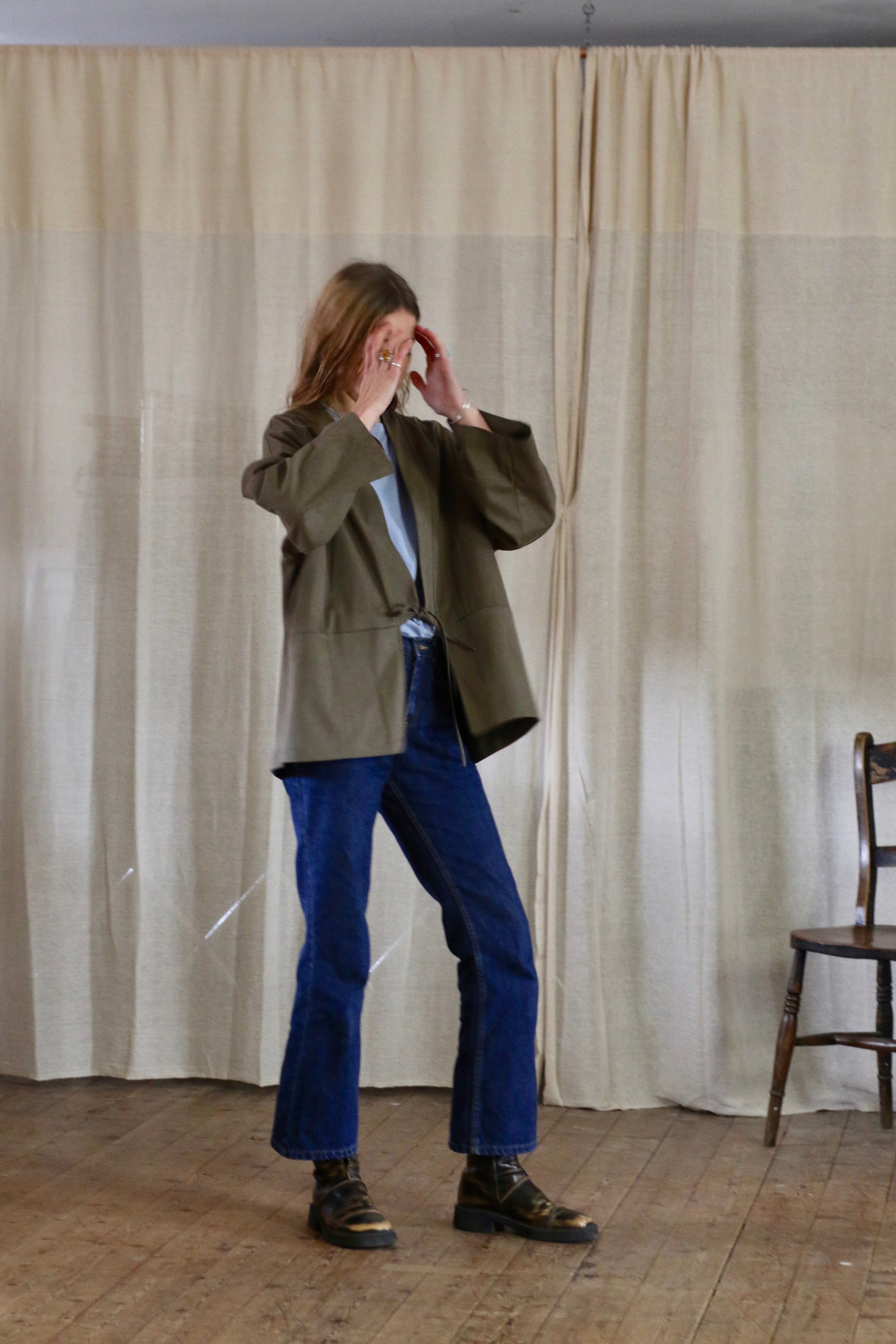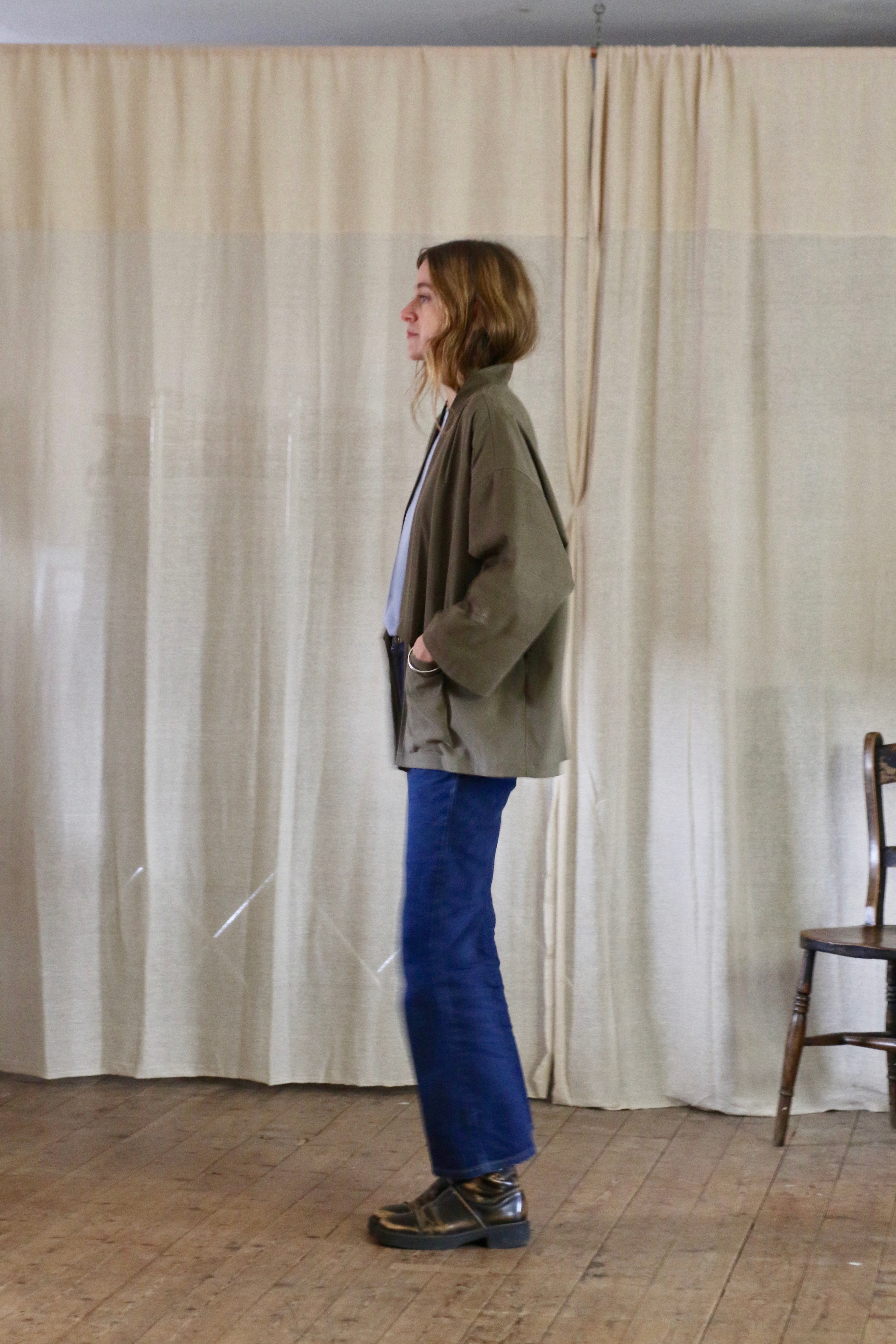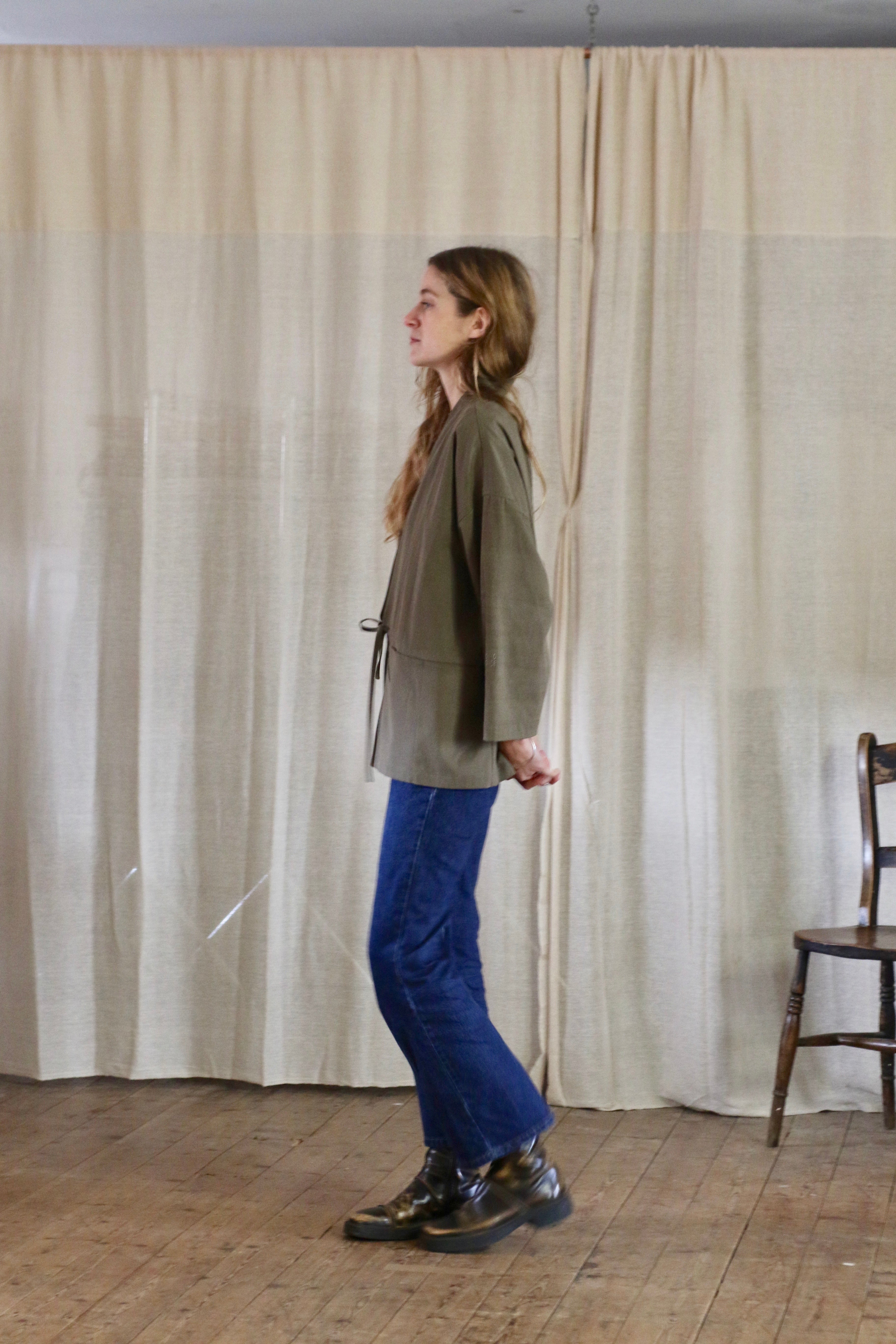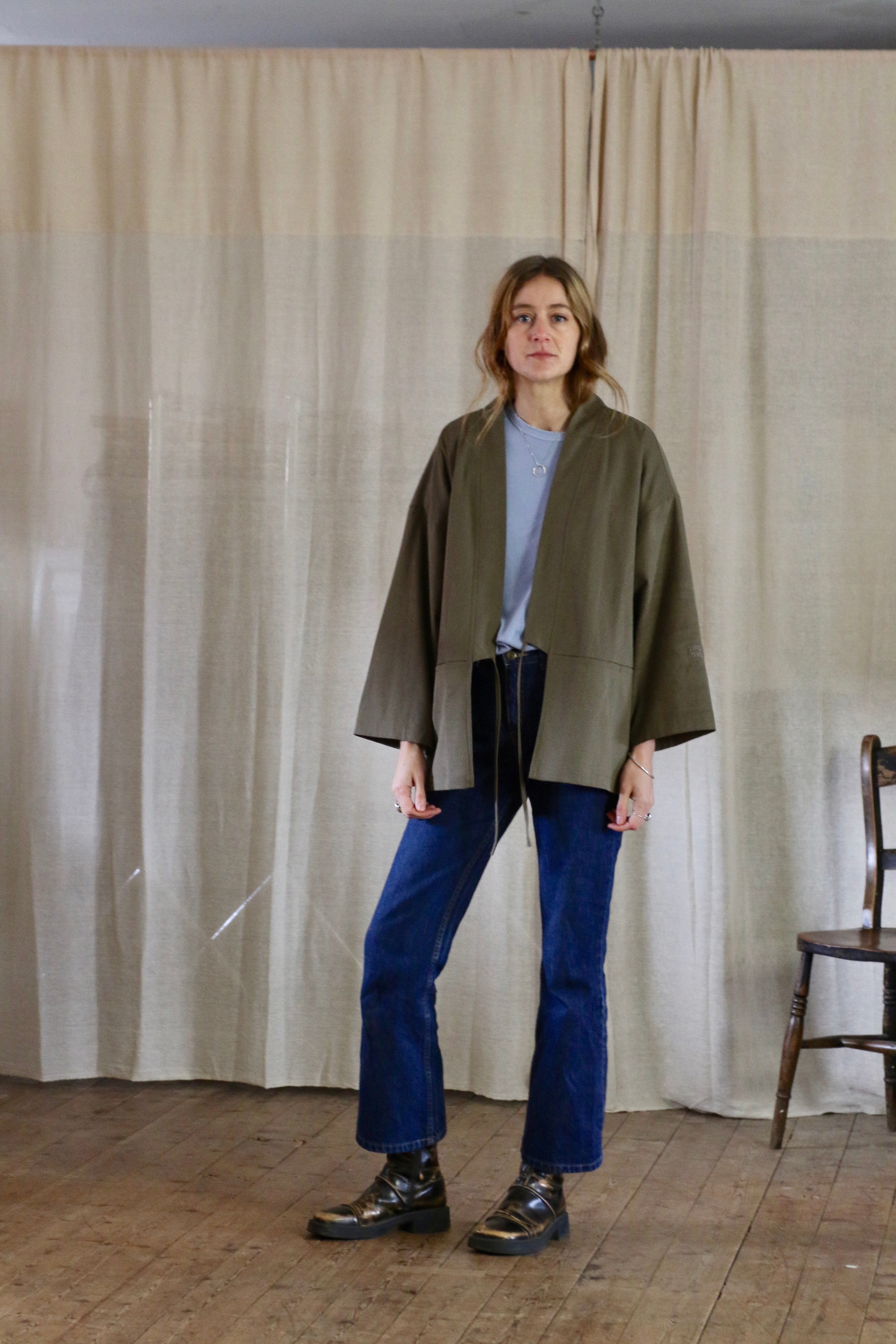 This Garden Kimono is made in dead-stock soft brushed cotton in a medium weight, I'm calling the colour artichoke green but it is a textured khaki colour. The medium weight means this is not a heavy jacket but more of a comfortable layering piece.