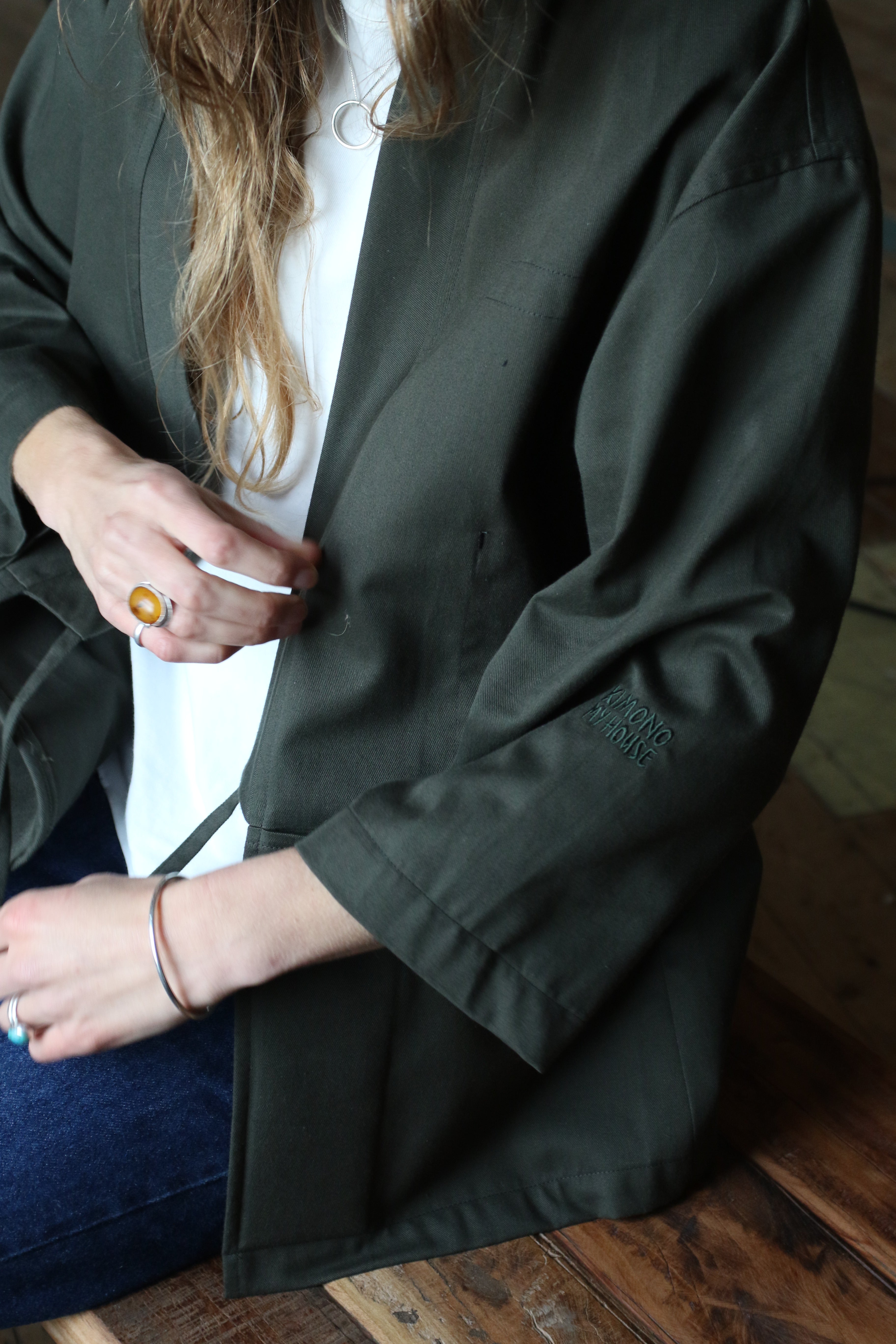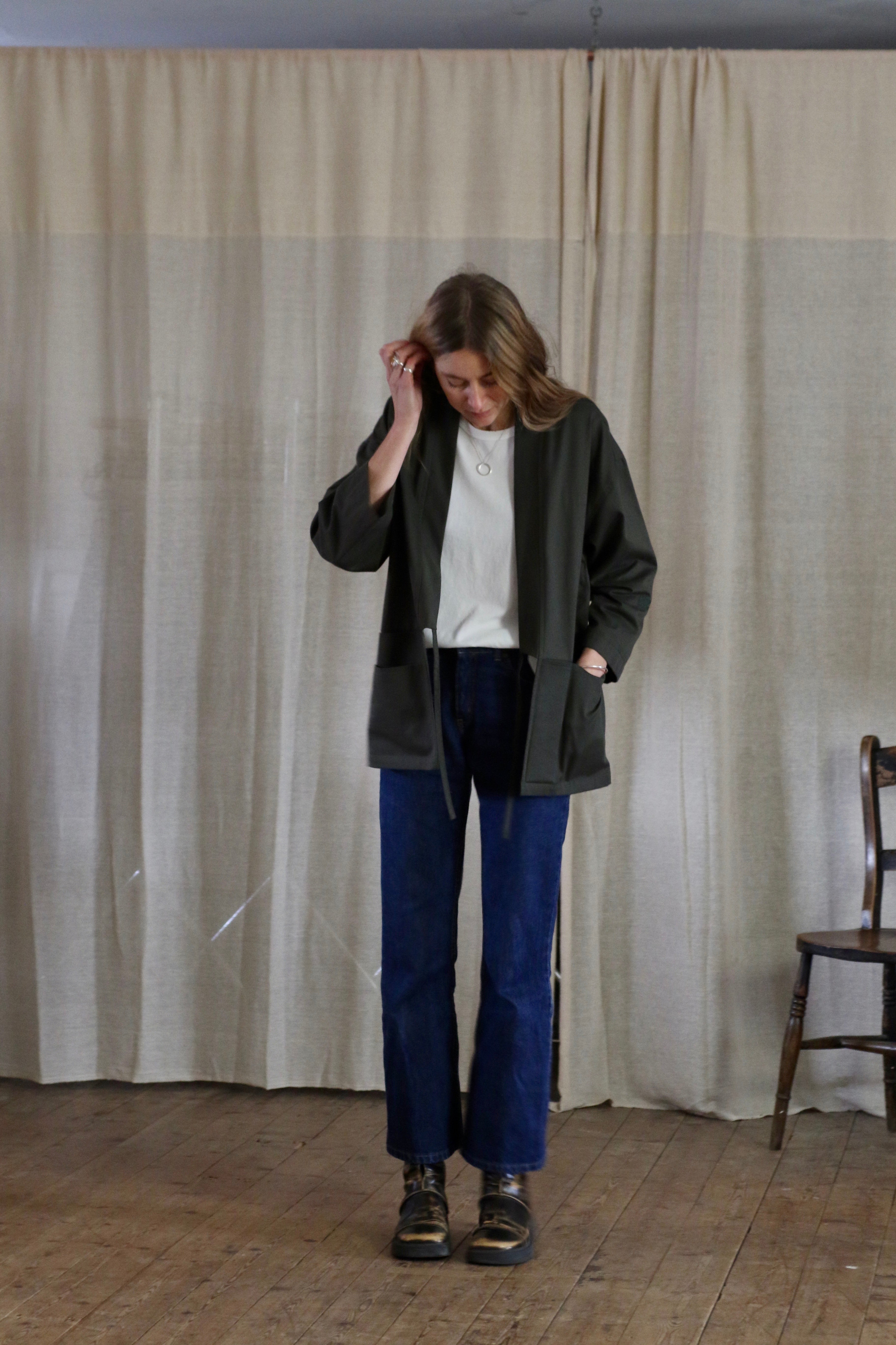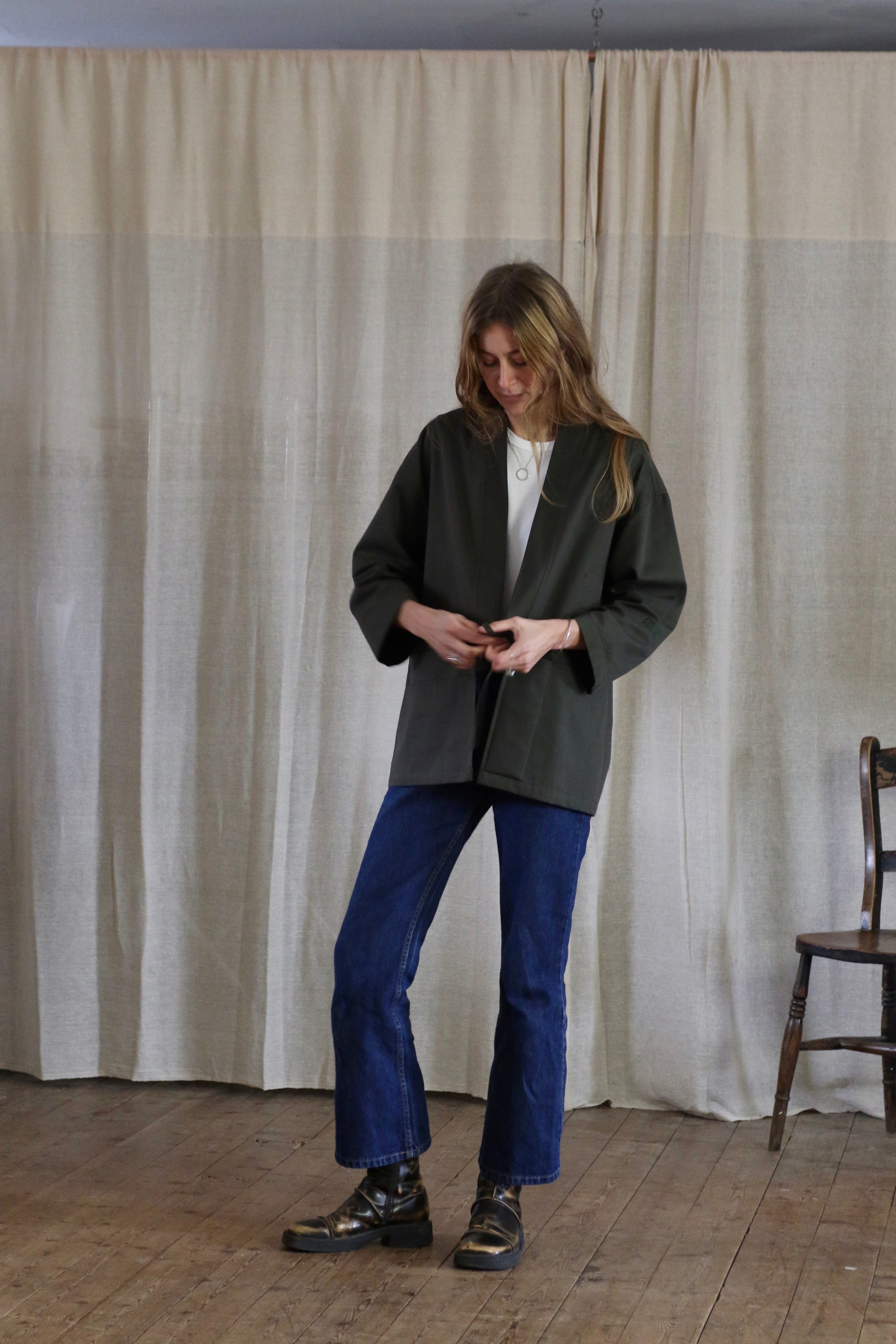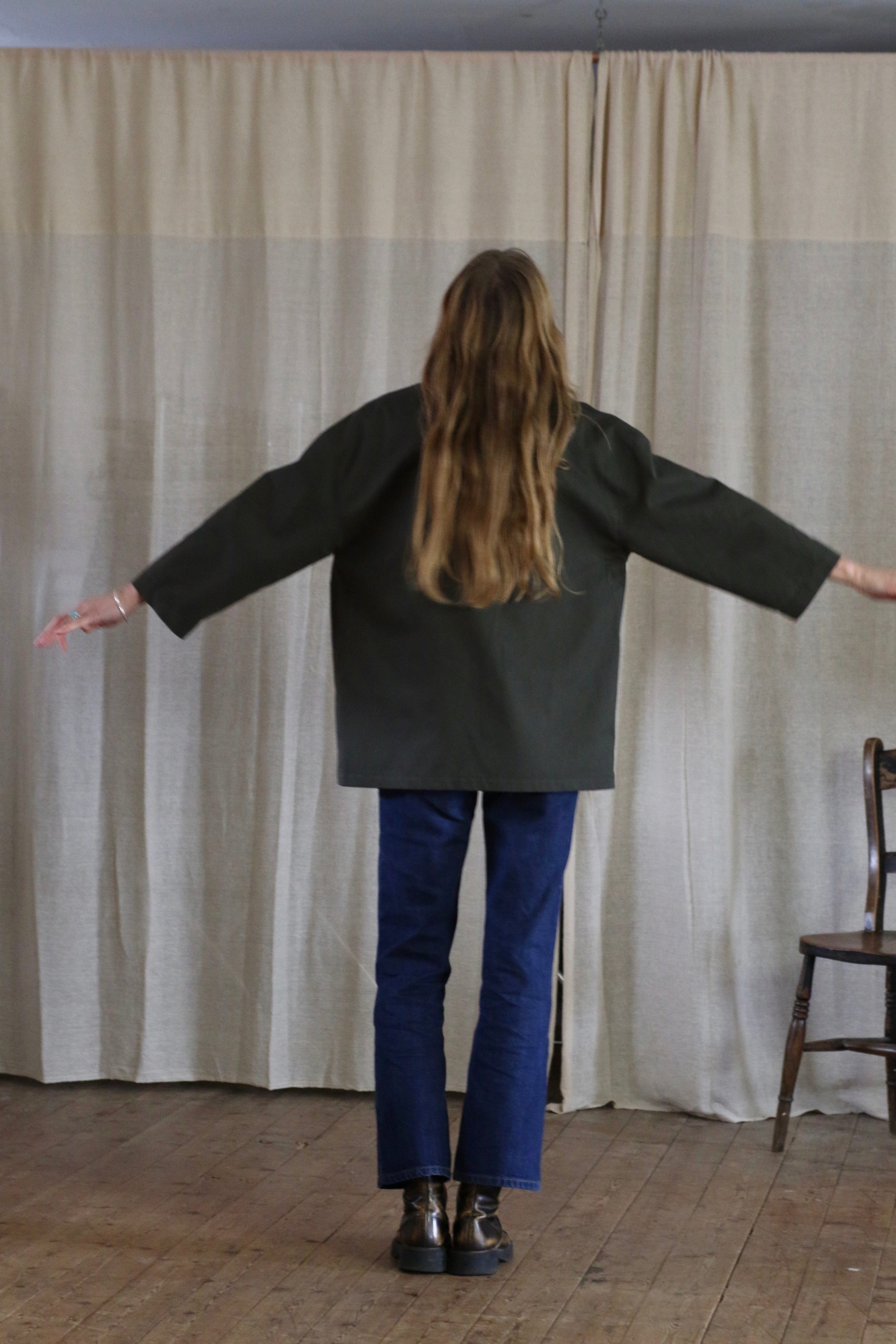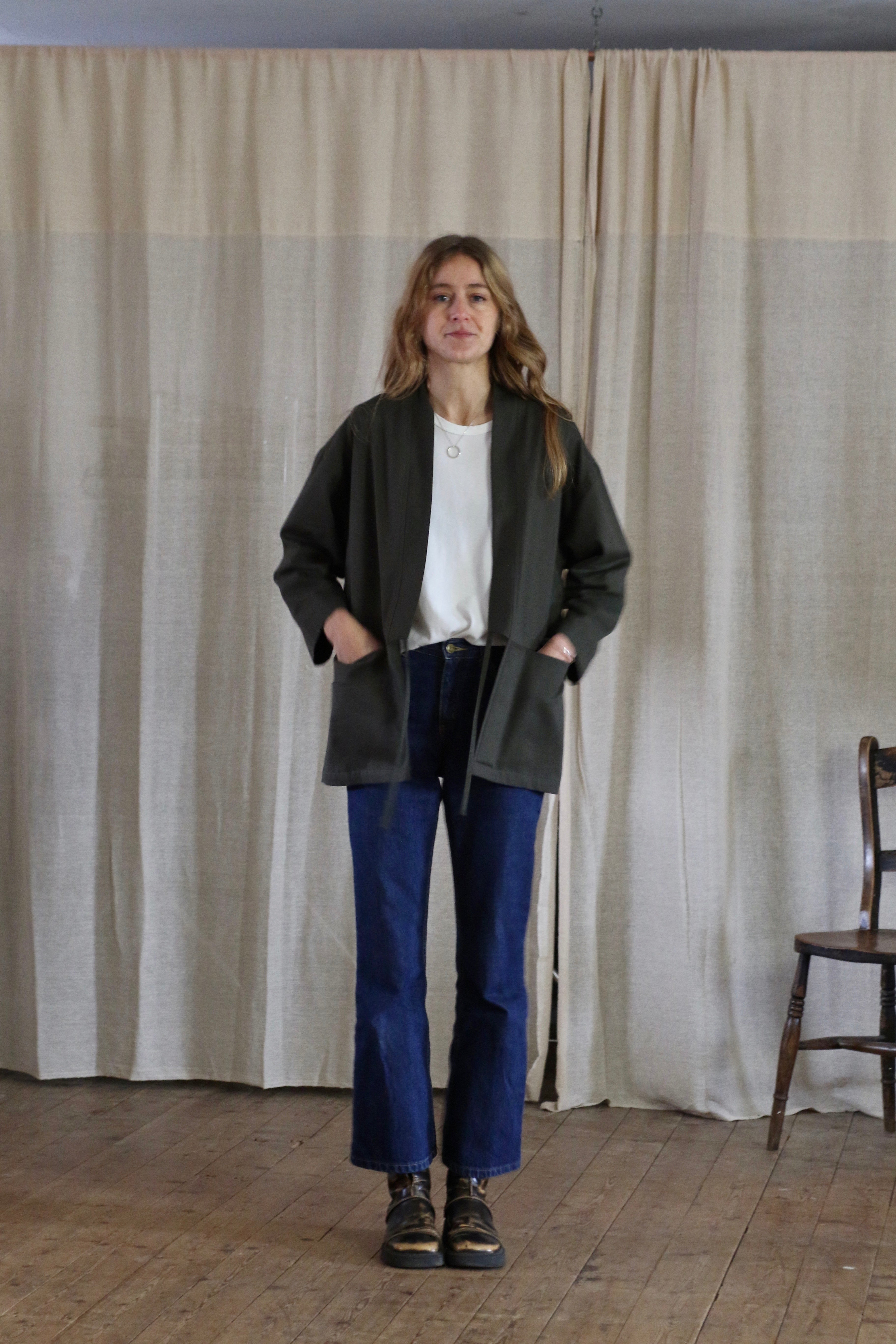 This Studio Kimono is made in dead-stock soft cotton twill in a classic dark green colour. The medium weight fabric makes a perfect layering piece.