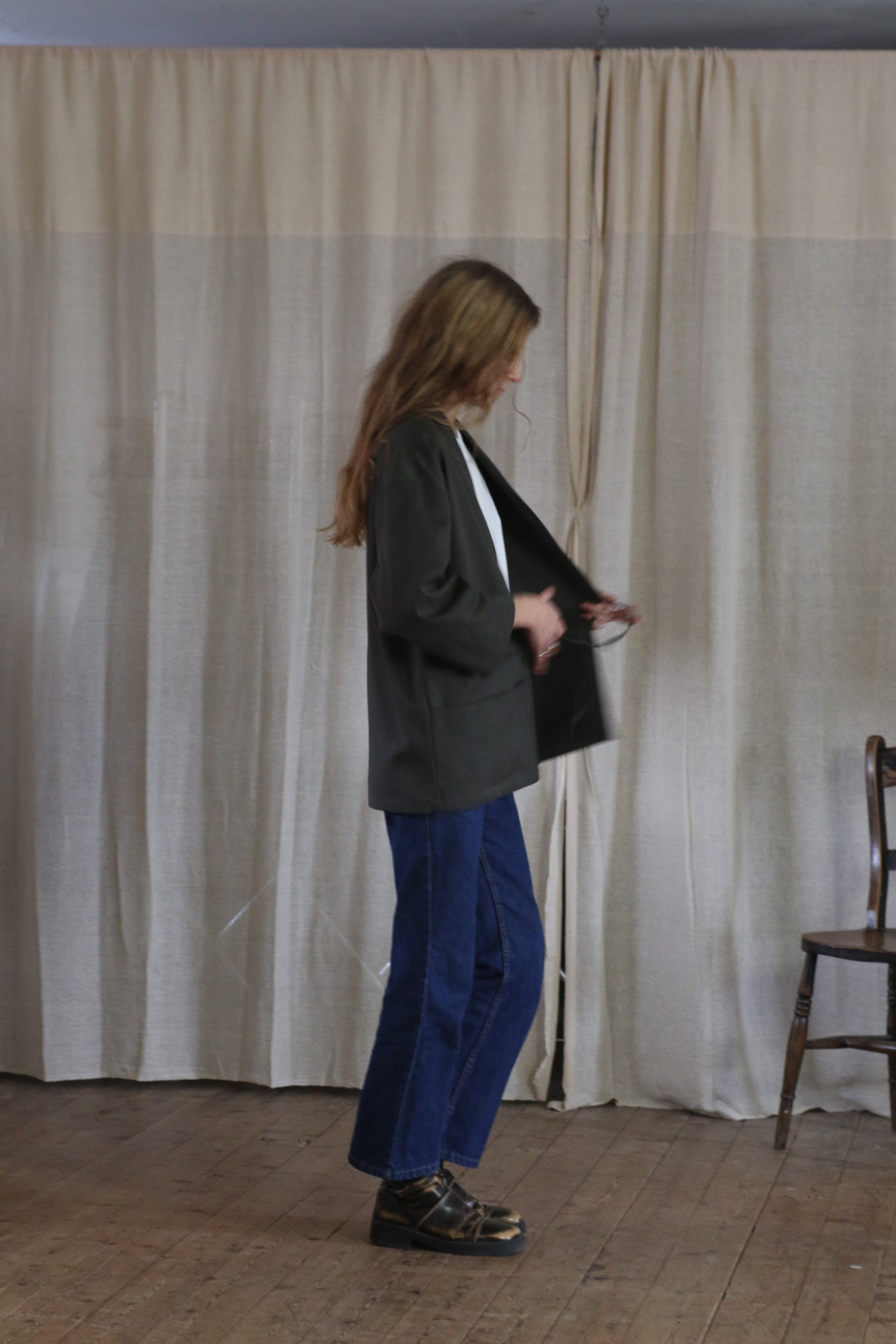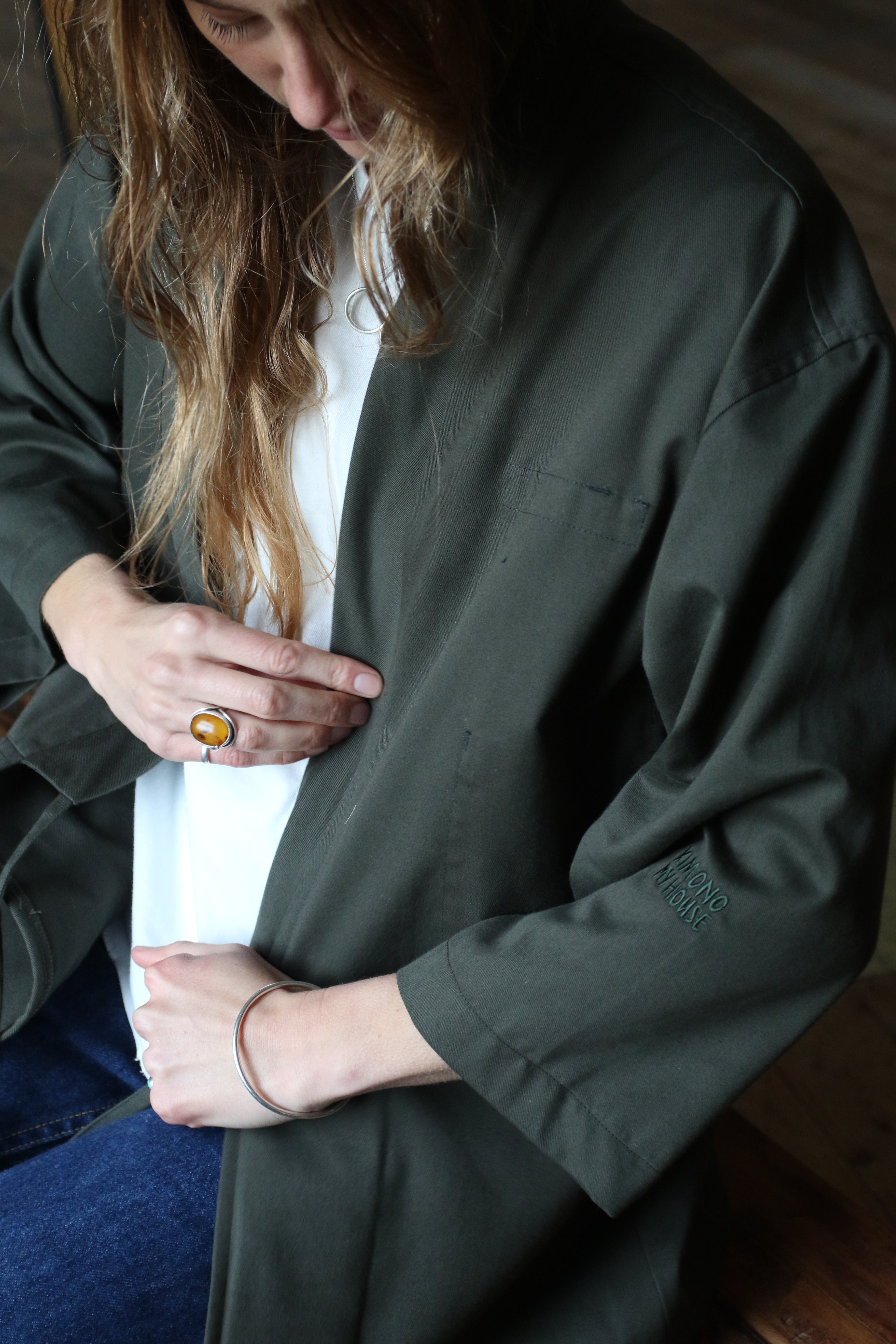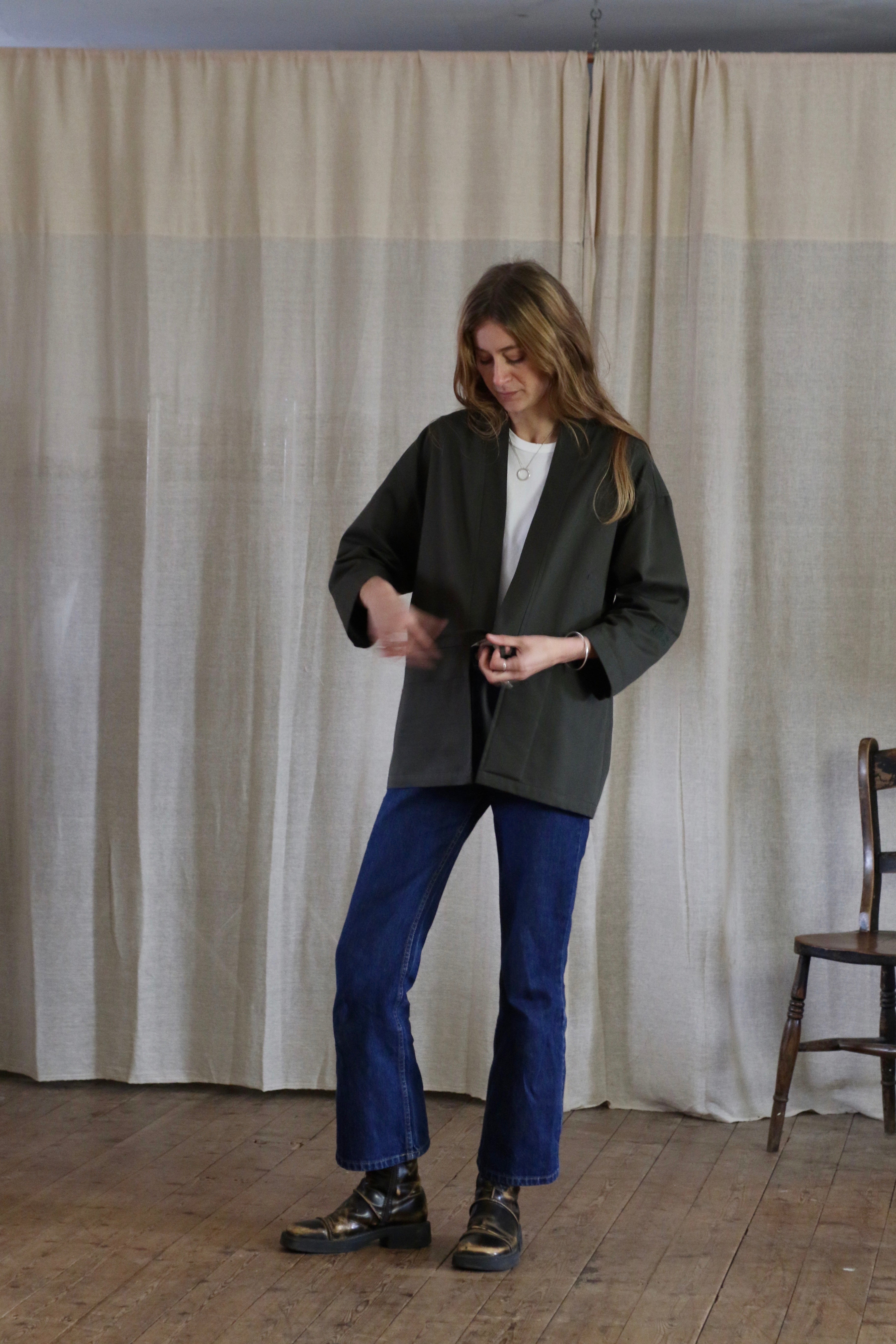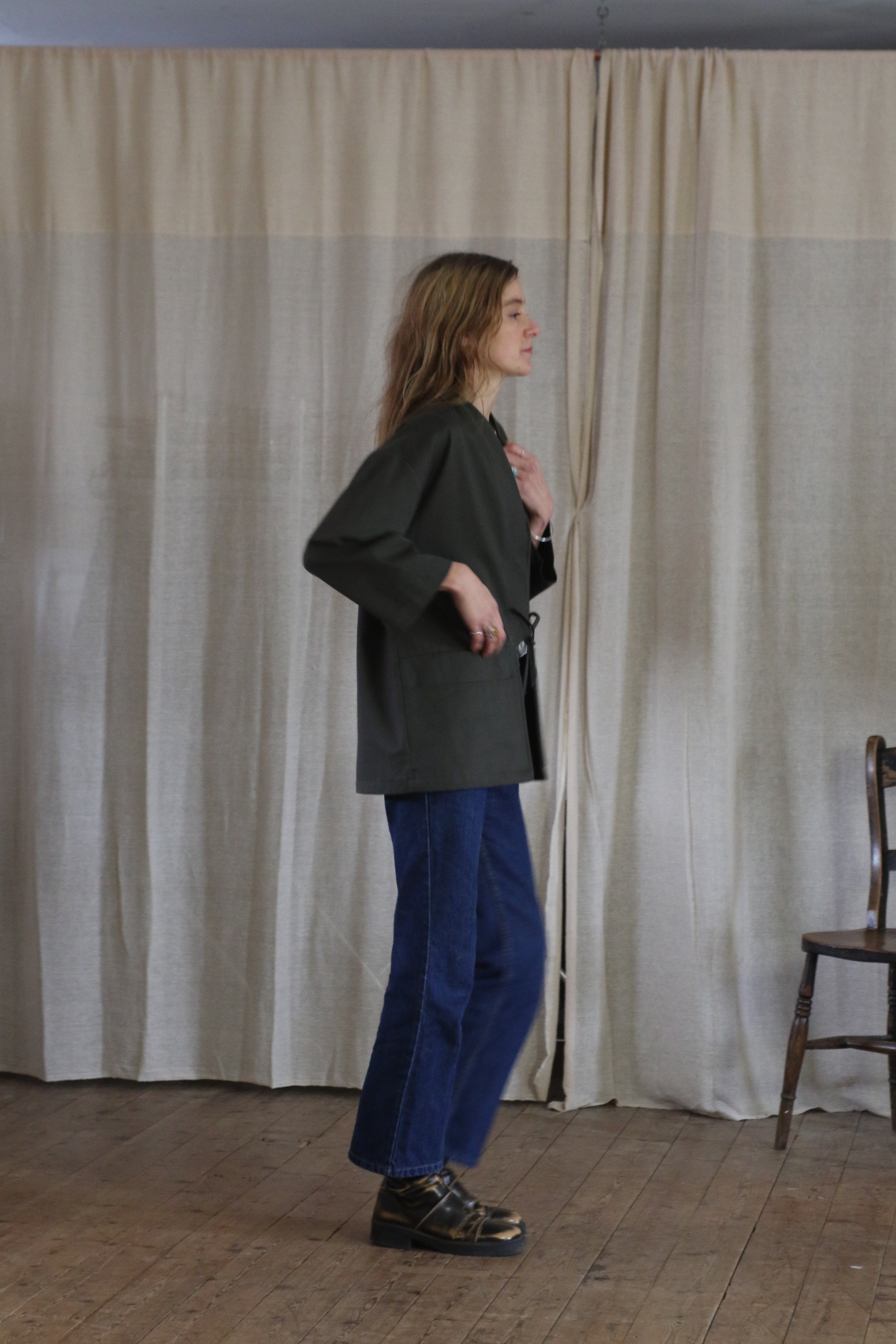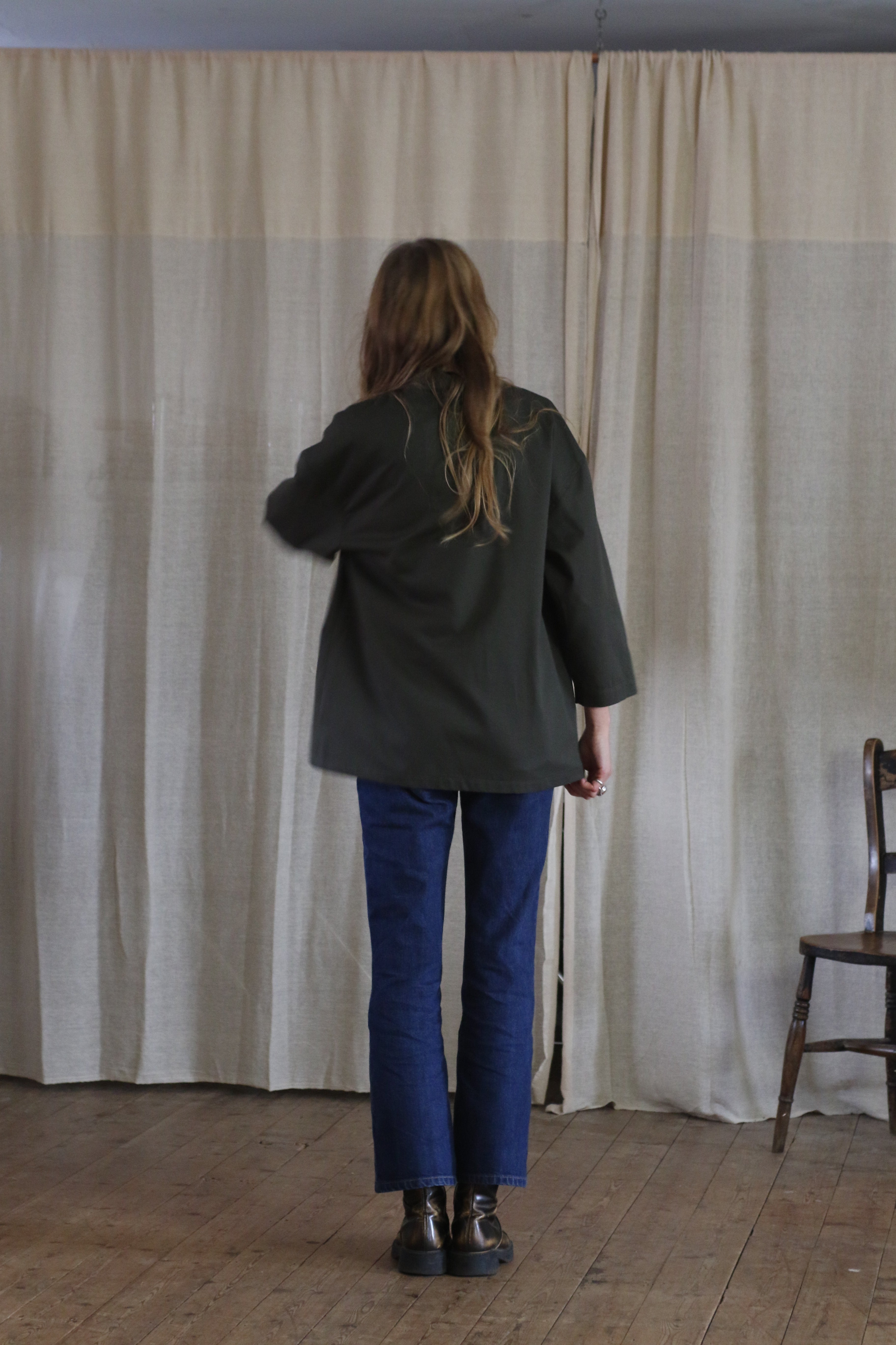 This Studio Kimono is made in dead-stock soft cotton twill in a classic dark green colour. The medium weight fabric makes a perfect layering piece.