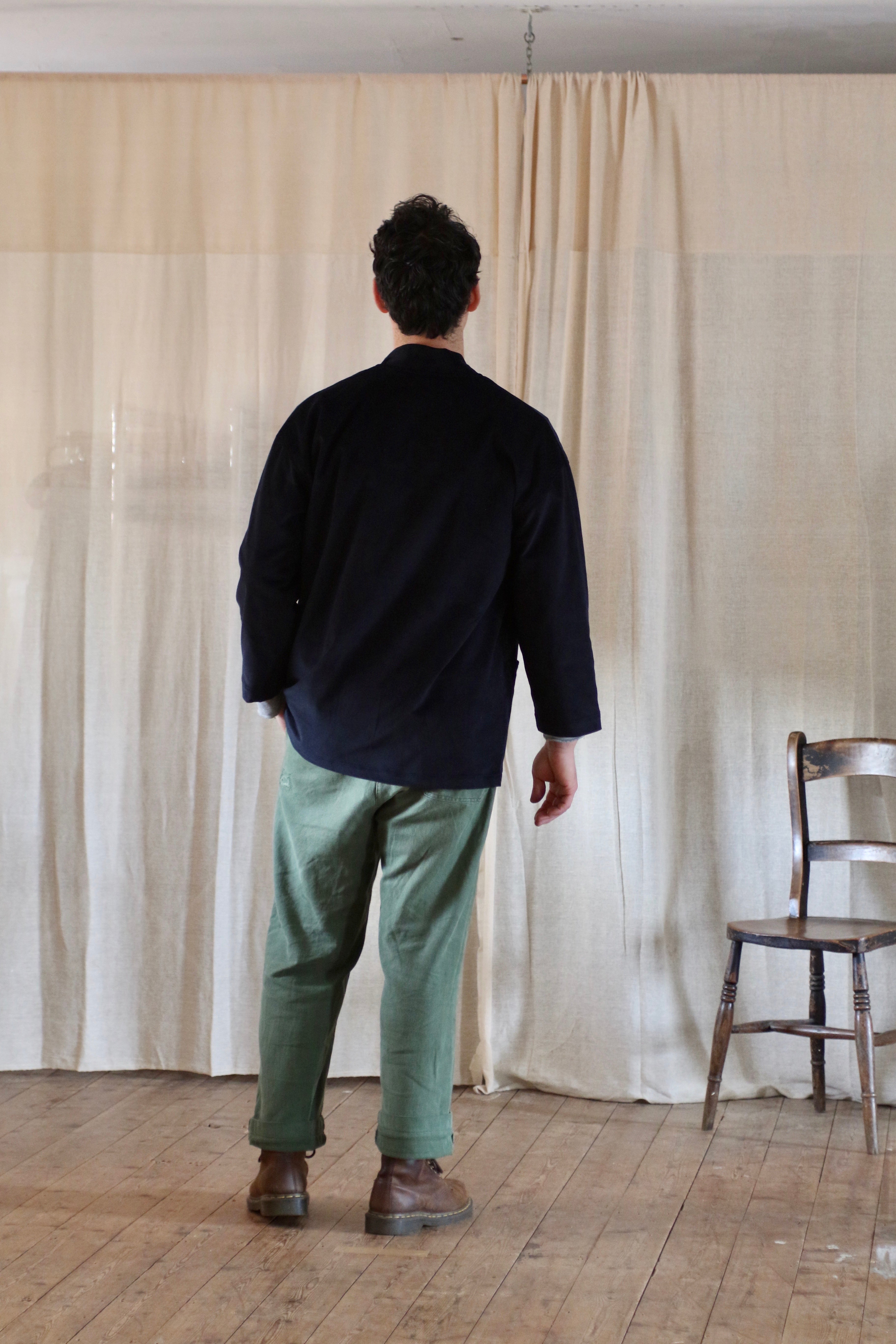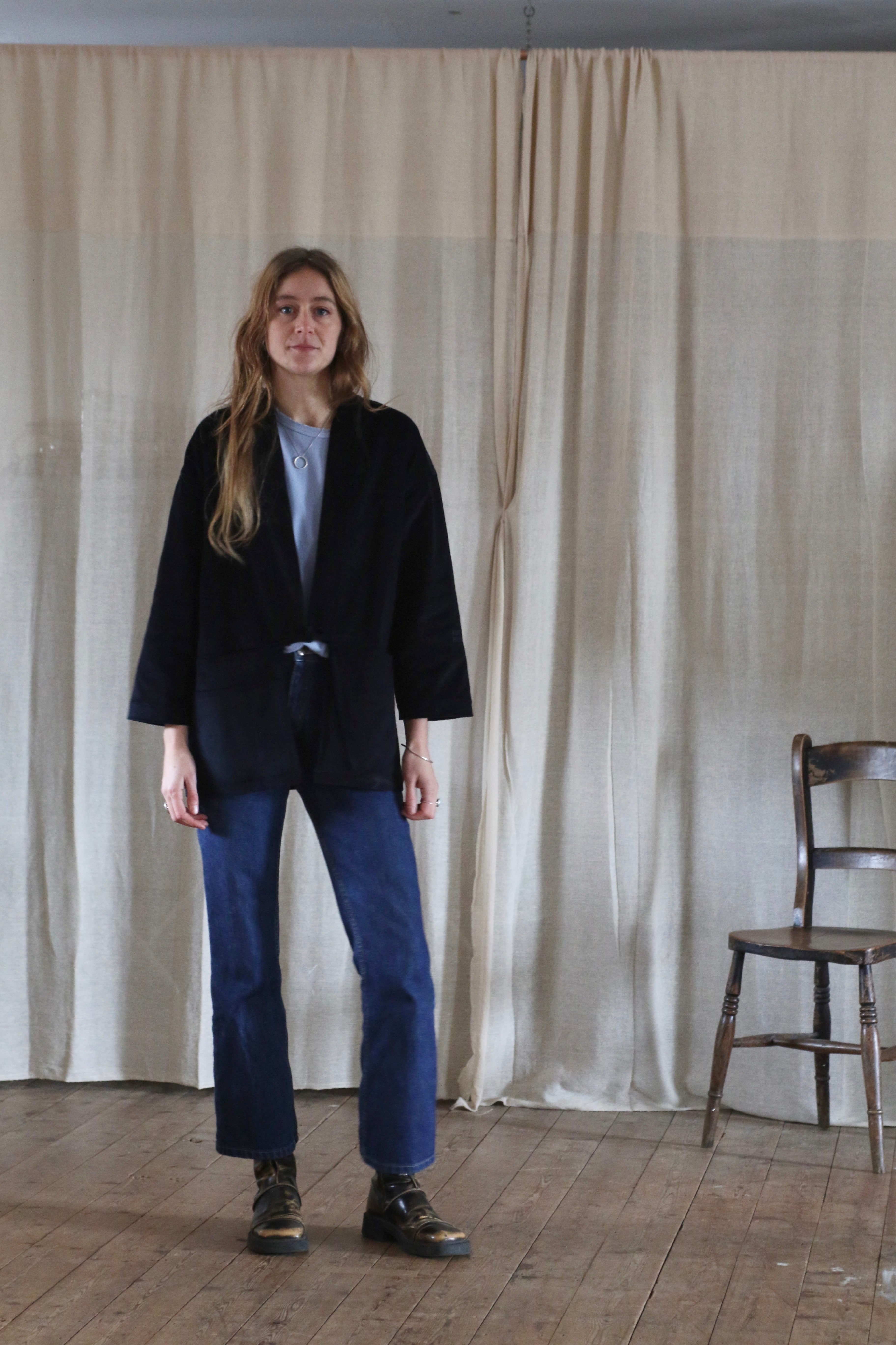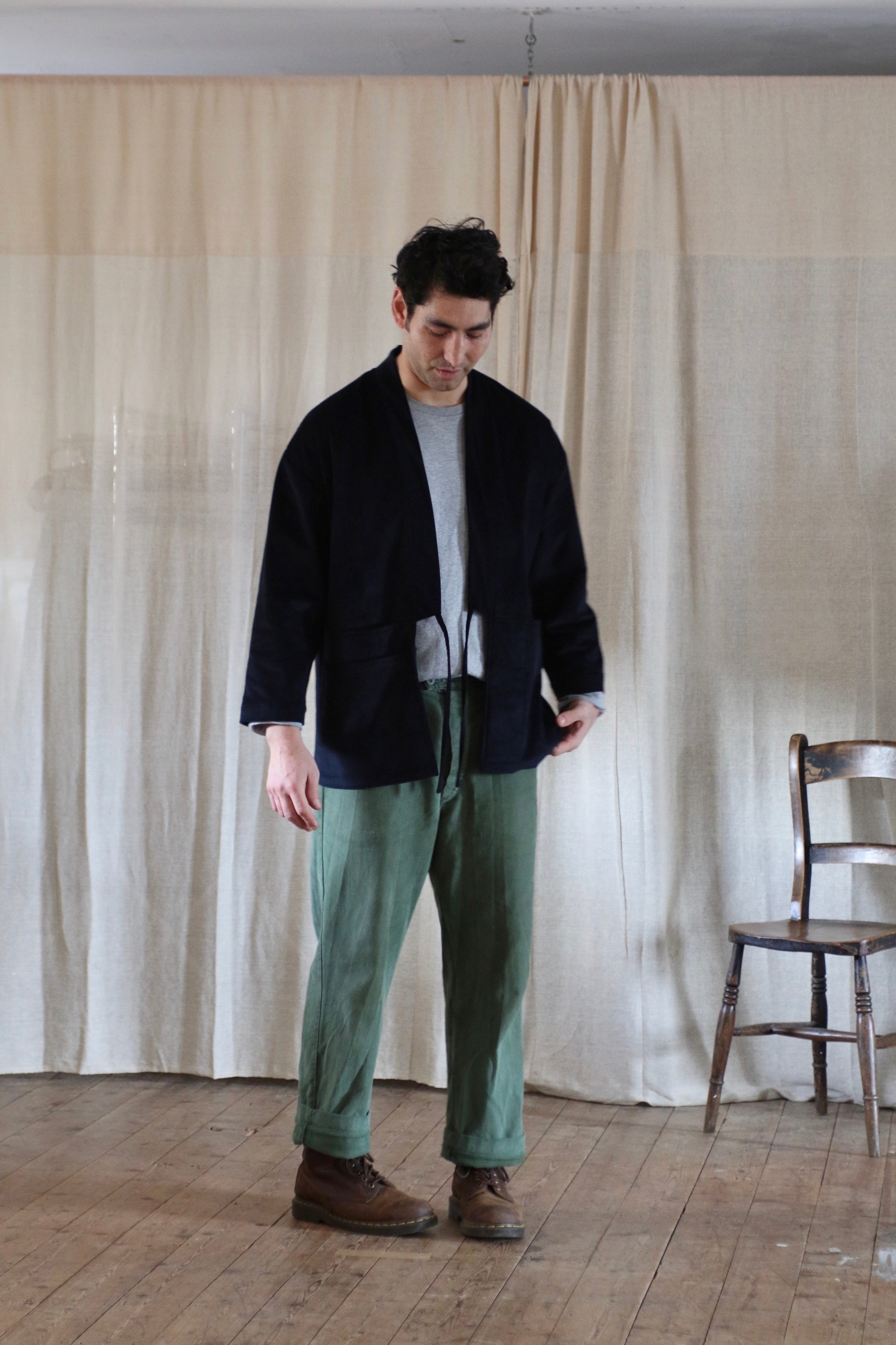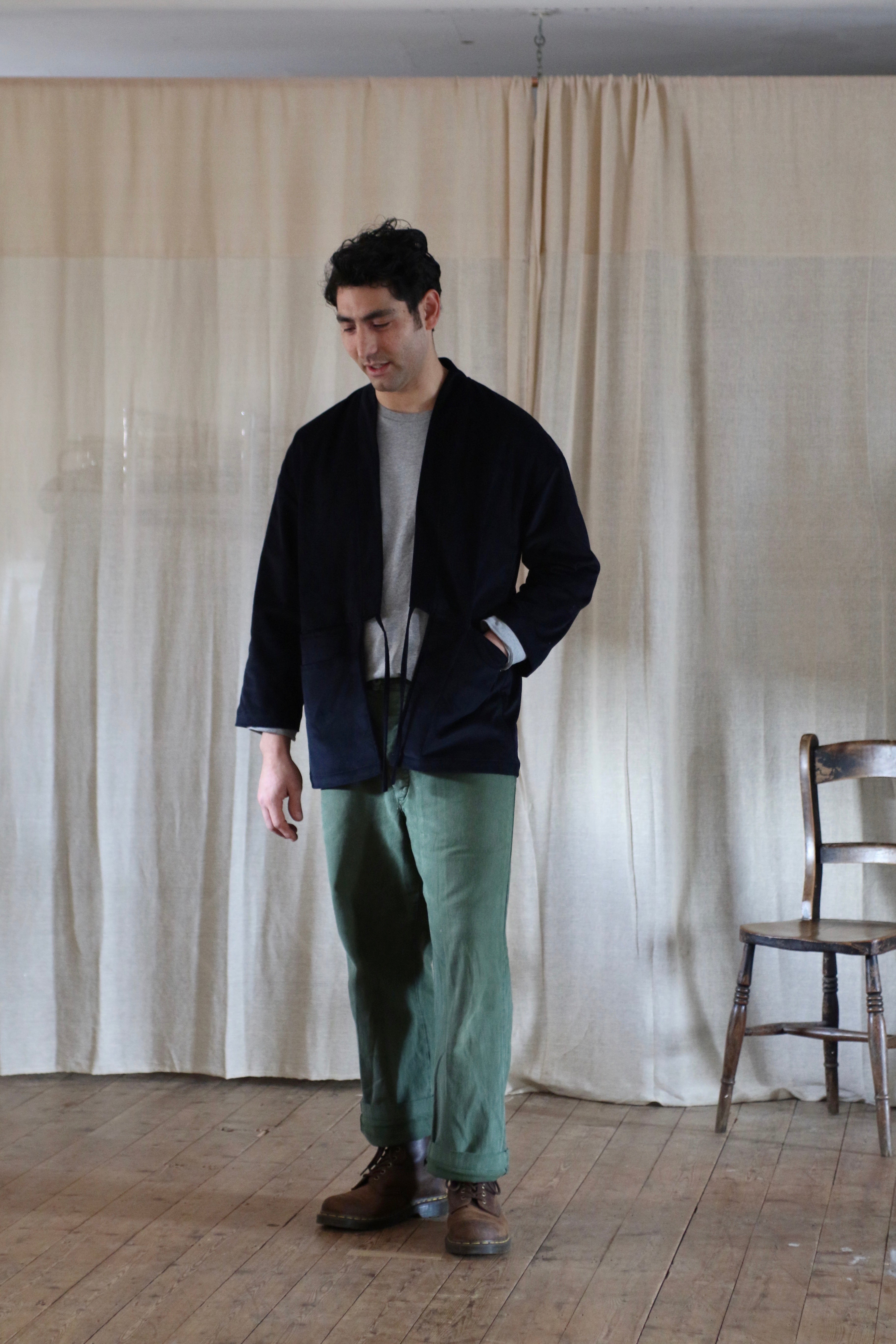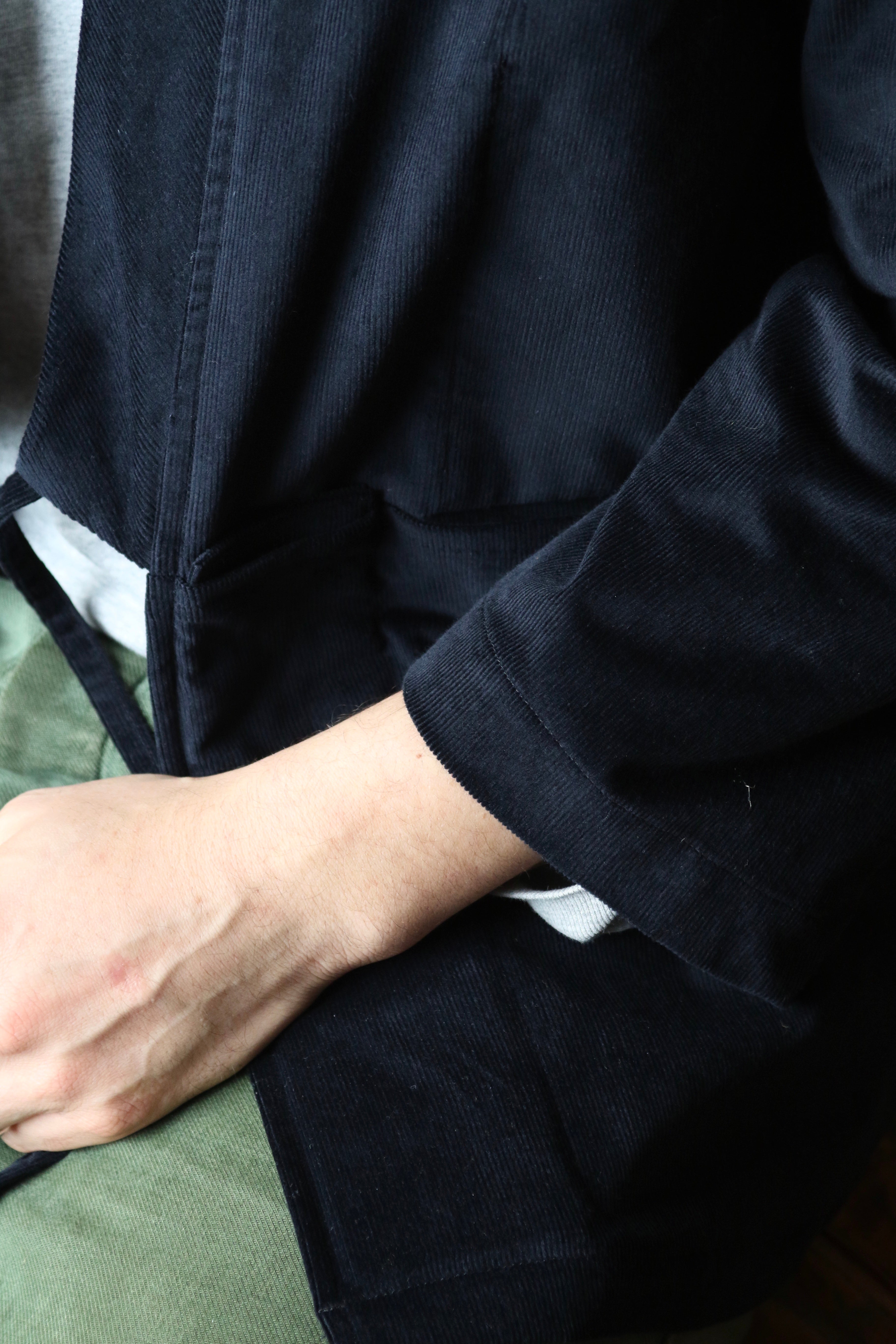 This Studio Kimono is made in dead-stock needle cord in a very dark navy blue, almost black.