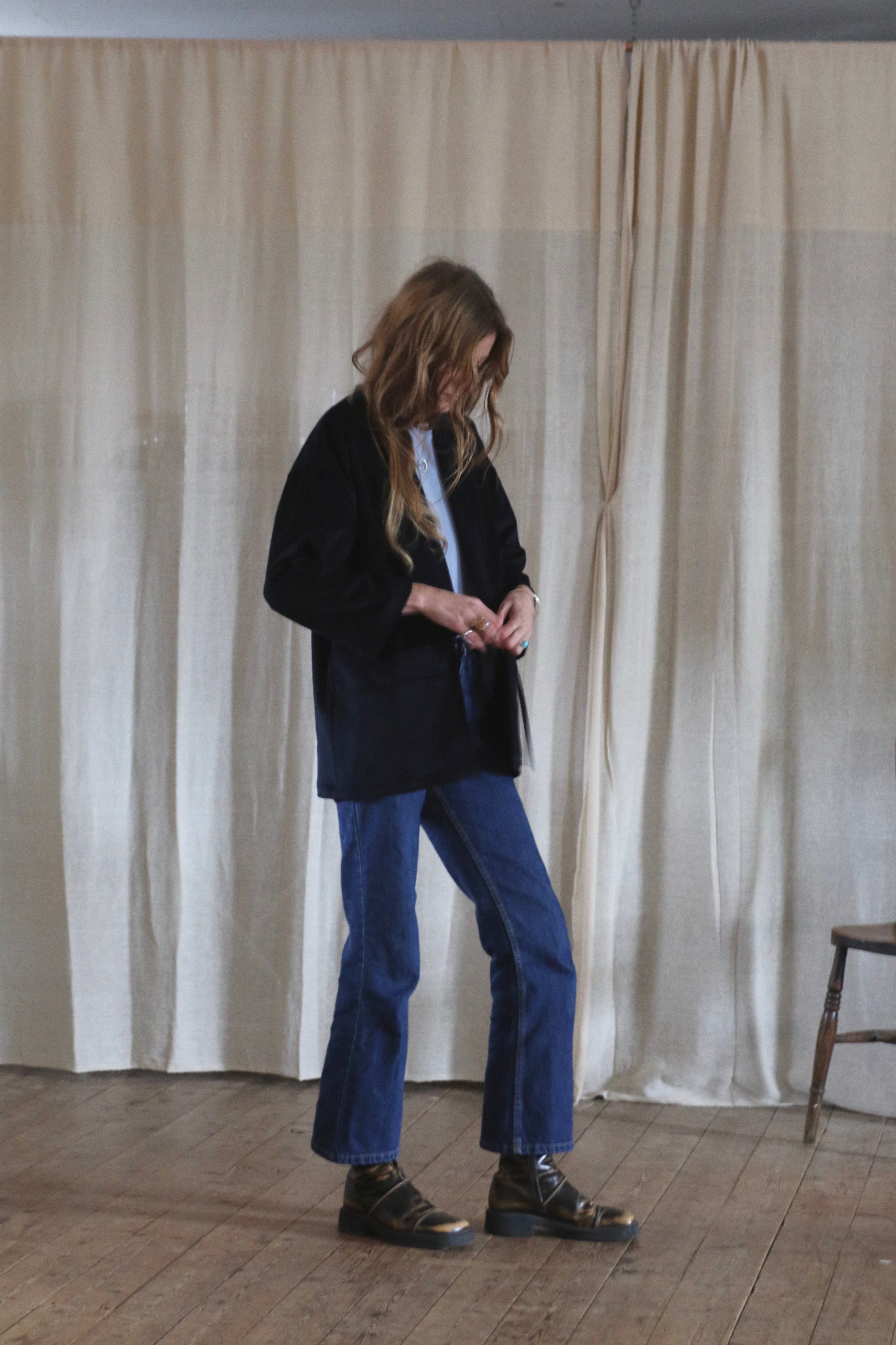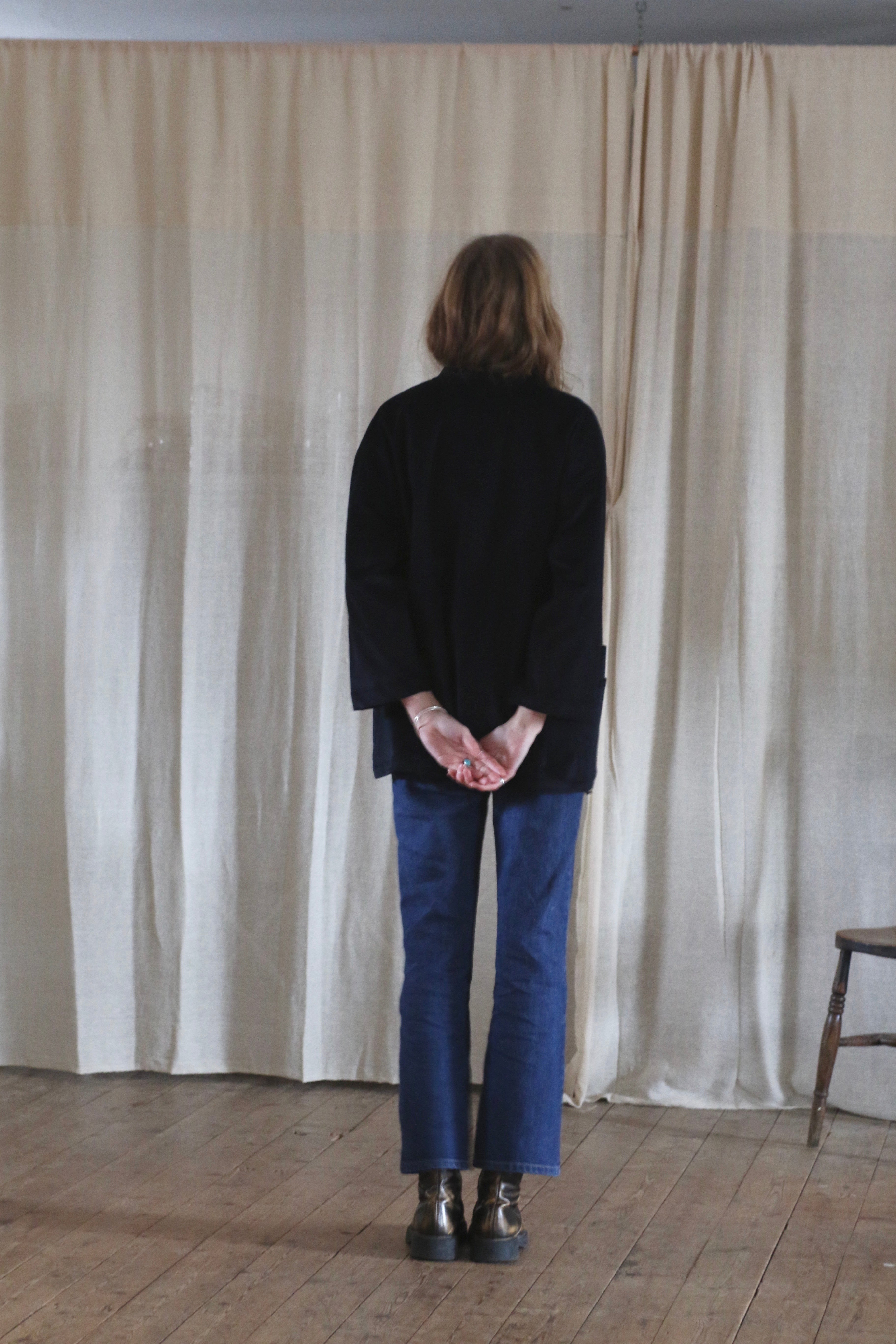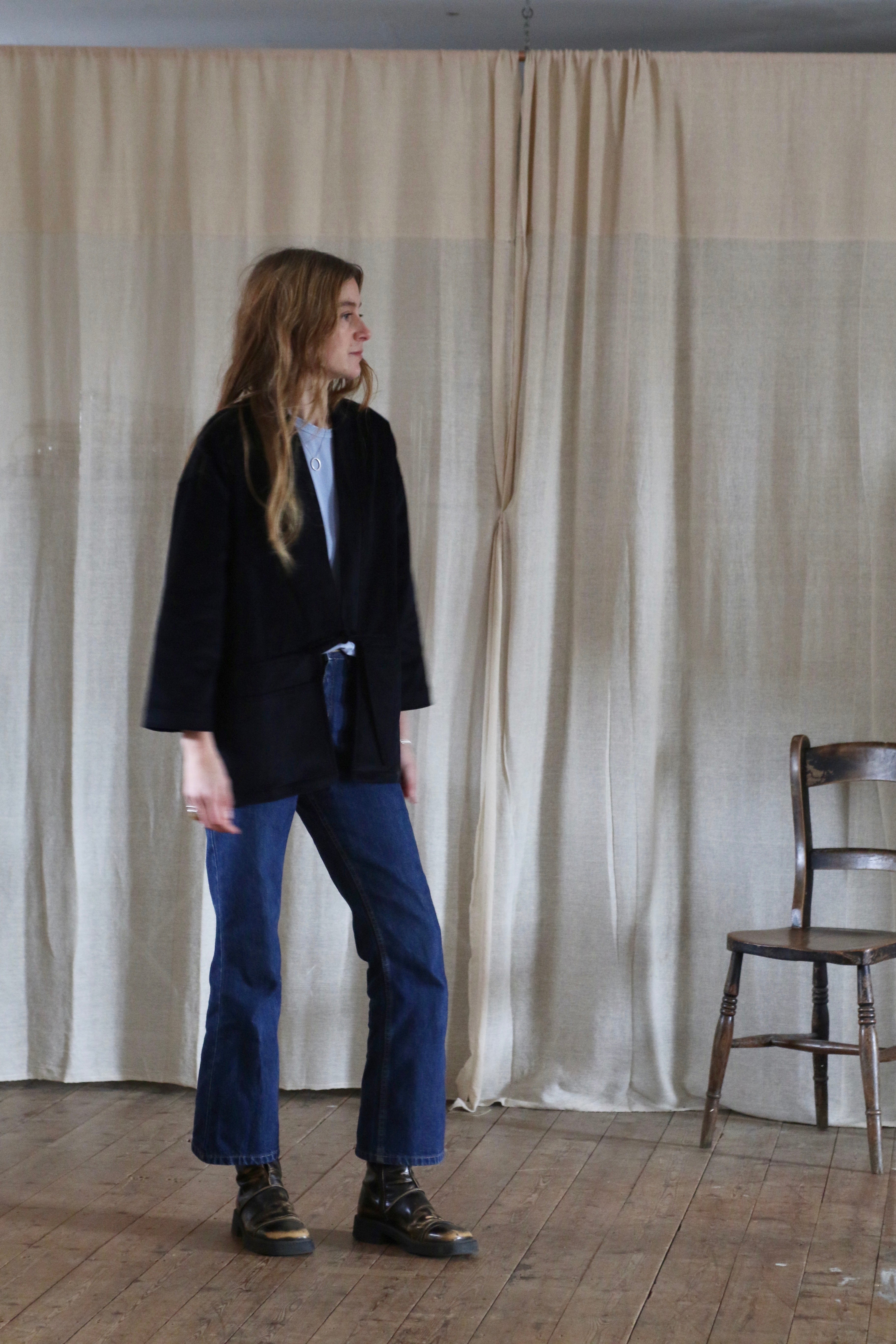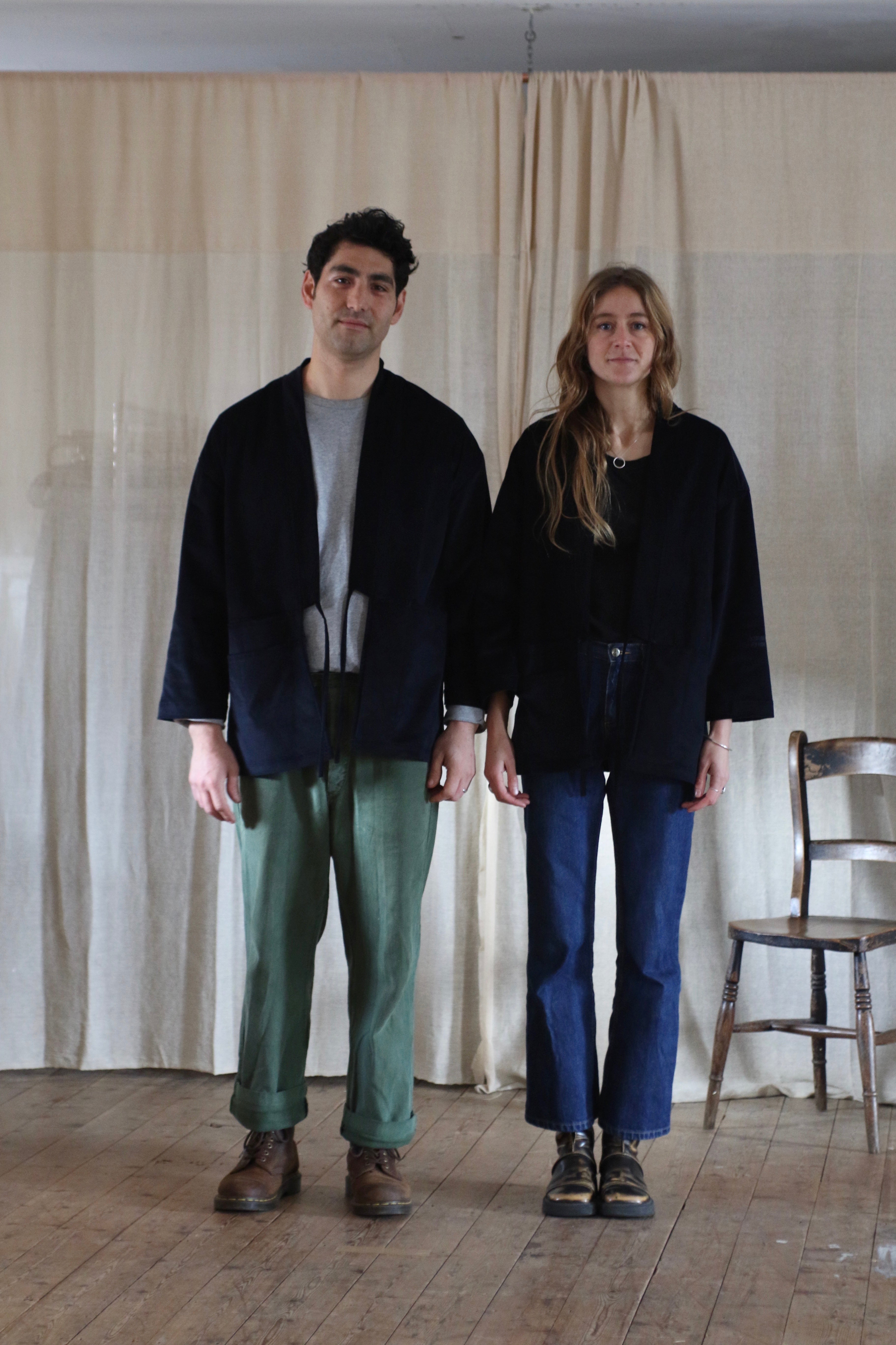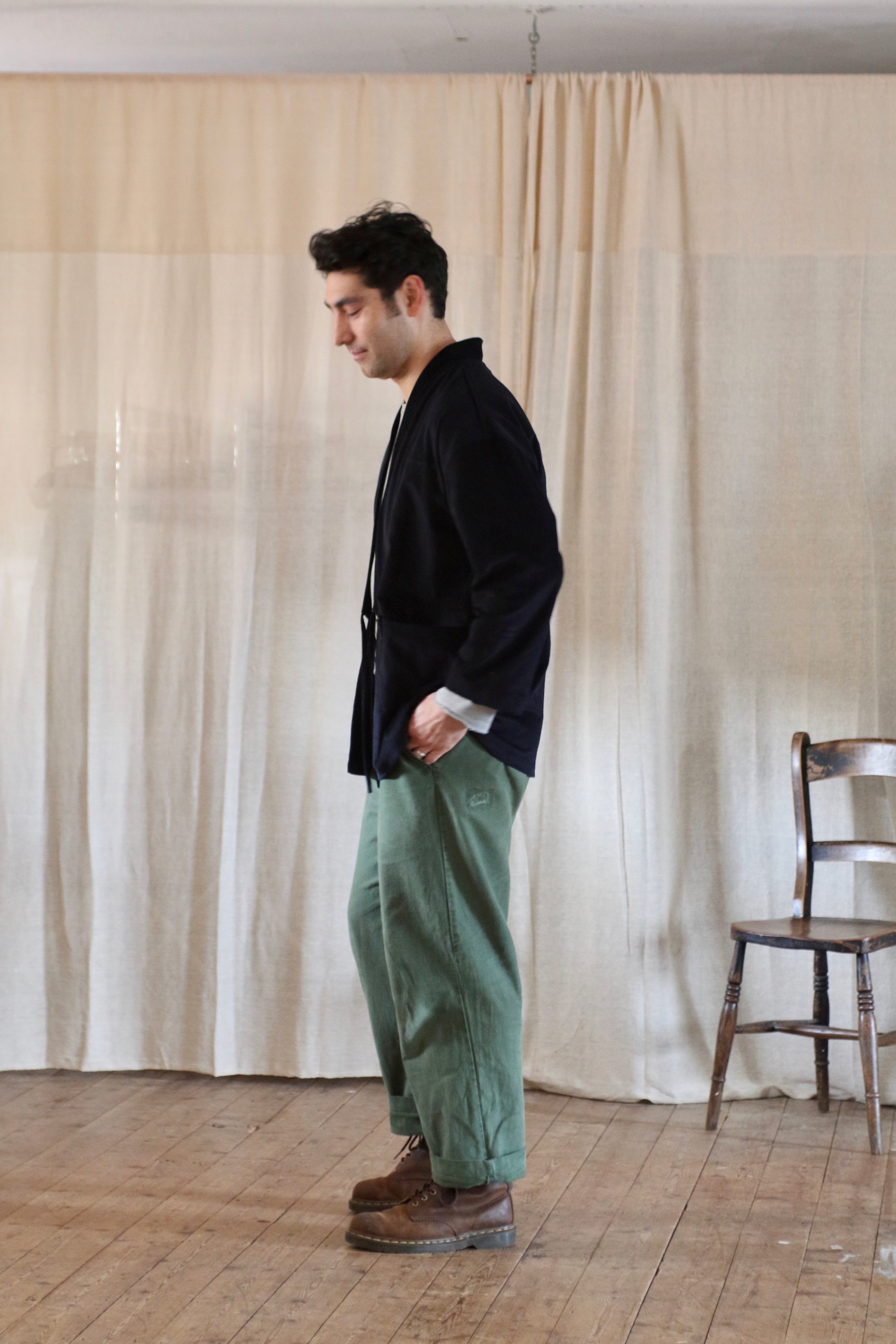 This Studio Kimono is made in dead-stock needle cord in a very dark navy blue, almost black.